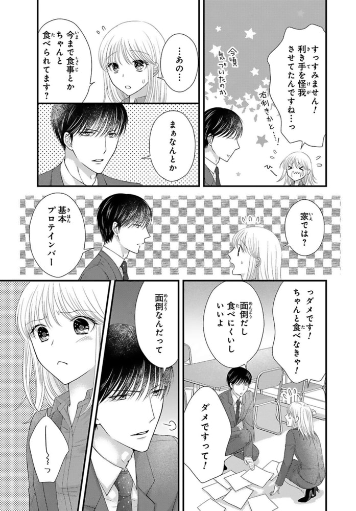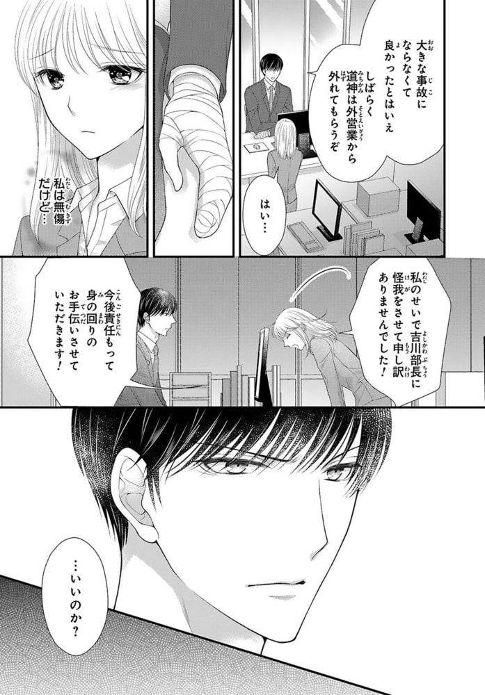 「そんな顔したら止められないだろ」鬼部長の吉川さんを交通事故で怪我させてしまった道神日菜子。責任を感じて身の回りの手伝いを申し出たが、失敗ばかりで逆に迷惑ばかりかけてしまう。仕事の手伝いがダメなら生活の手伝いを…と、料理を作ってもまた失敗…!自信を失い落ち込む日菜子に、部長は怒らず優しく励ましてくれて…。仕事では厳しいけど実は優しい部長に惹かれ、迫られて…。恥ずかしいけど嫌じゃない、部長の愛撫に感じてしまい、びしょ濡れになってしまう。そんなカラダの変化を隠したいのに部長はすぐに気づいてしまって…。優しいけども的確に気持ちいいところを攻めてくる部長に、耳元で囁かれたらもう我慢できなくなり…っ!