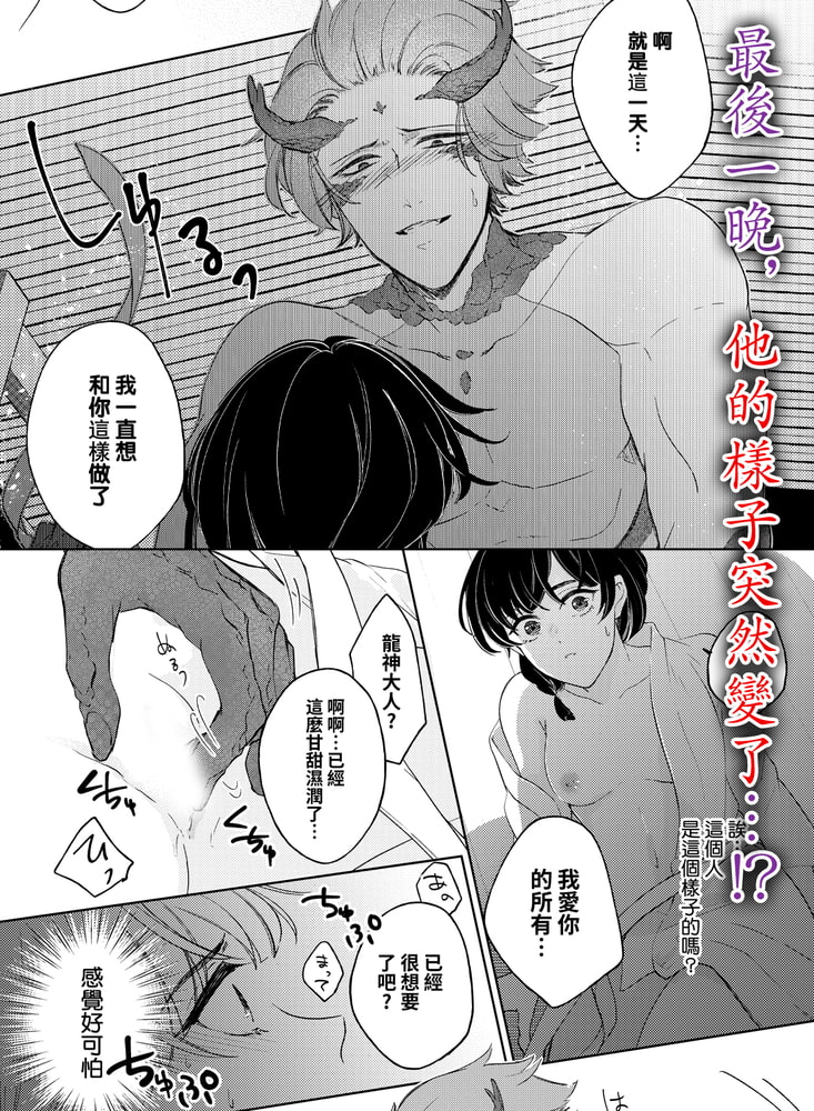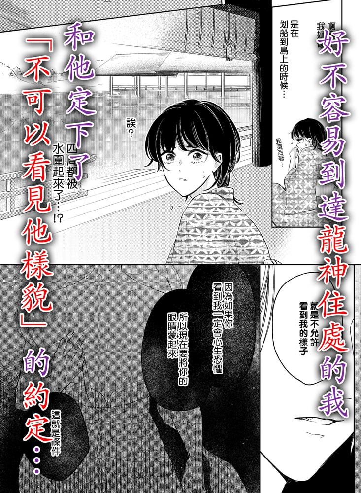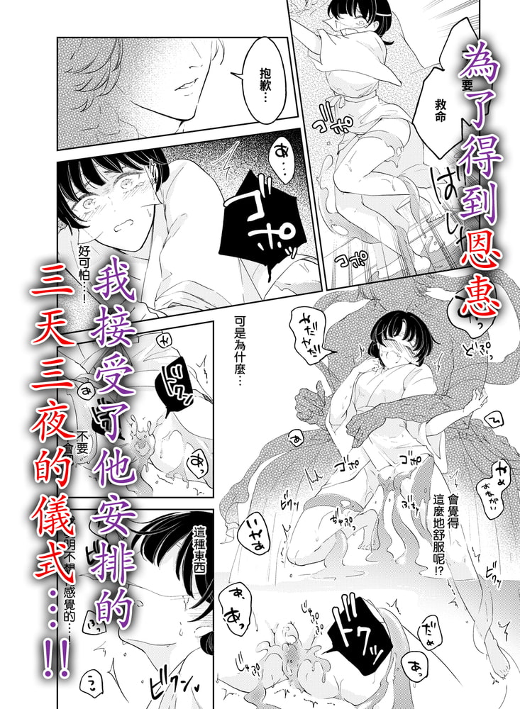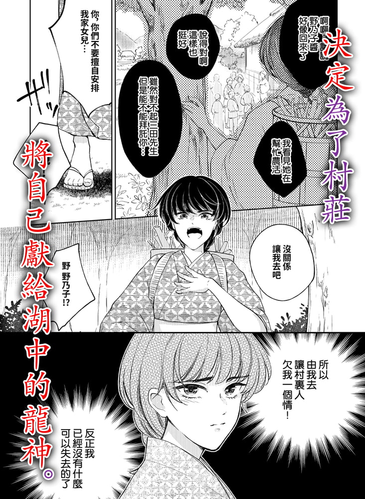 “啊…有什麼進到…進到身體裏…來,了…!!”因為生不出孩子被從家裡趕出來了的野乃子。為了擺脫被當作是廢物居無定所的日子,决定要成為村裡龍神的活祭品、—但,在湖中城裡見到的他卻“約定好了。絕對不可以看到我的樣子”定下了這樣的約定。就這樣在什麼都不知道的情况下開始了為期三天的“授予恩惠的伊勢”…。被非人的龍神翻弄遍了身子,忍受著苦悶與快感的野乃子。然而就在第三天,龍神卻突然有了轉變——?“…那是說,願意和我定下誓約嗎?”※此處為R18版。全年齡版正在【DLsite comipo】配信中!