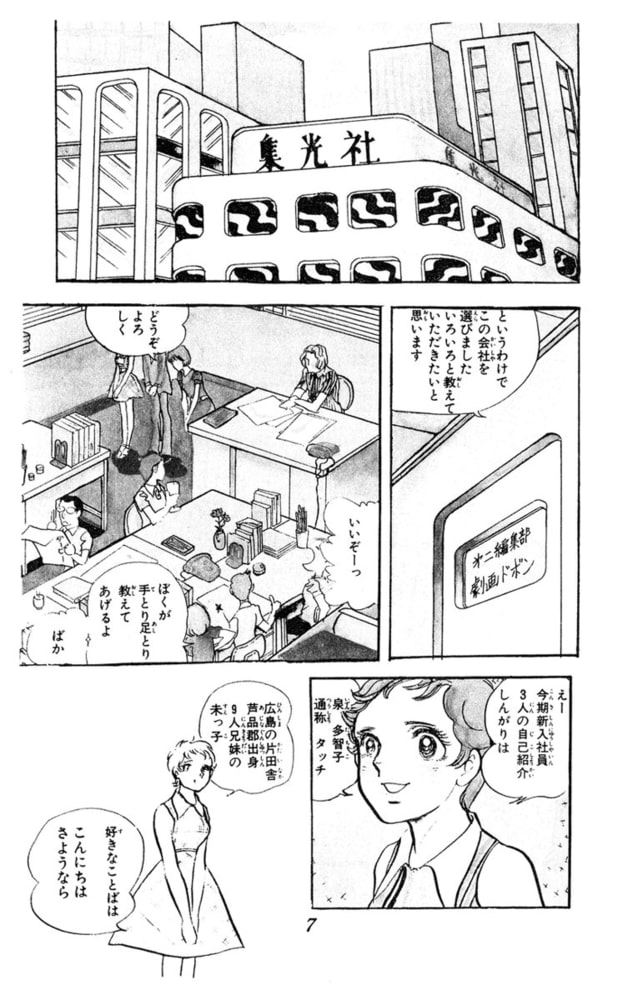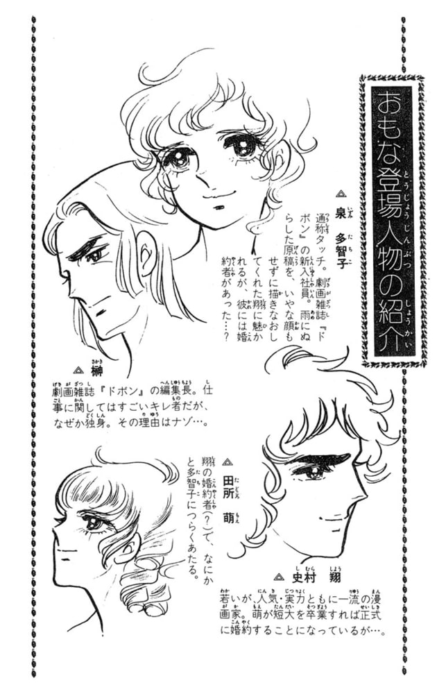 泉多智子・通称タッチは漫画雑誌「ドボン」の新入社員。ちょっとドジでマジメな女の子。担当した人気漫画家「史村翔」に魅かれていく。しかし彼には婚約者があった・・。涙あり、笑いありのペーソスあふれる傑作。他に短編コメディ「ミーナとニーナ」を収録。