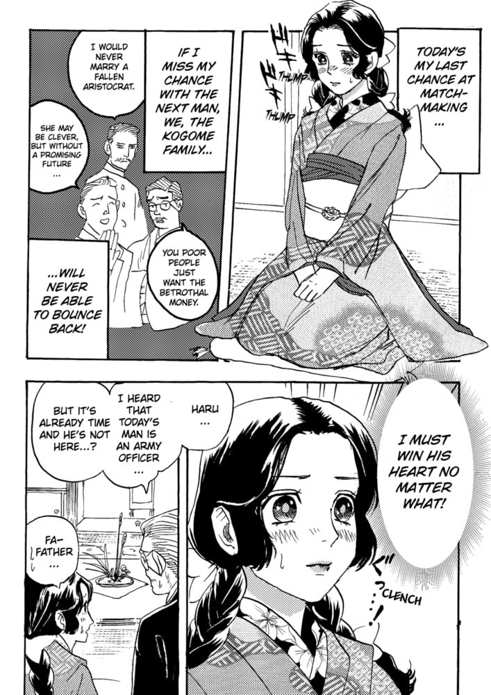 Using her status as a fallen aristocrat as the reason, female student Haru falls into a slump after being turned down by all of her suitors one after another. Her final suitor happens to be an officer in the army. In order to rebuild her childhood home, she is determined to ensure he doesn’t turn her down. Just as she strengthens her resolve, Warrant Officer Narihira appears on the scene riding on horseback. As he approaches, he asks her, “Will you marry me?” The instantly dismayed Haru delays her response, asking him to give her more time to consider. Passionate about her studies, the serious Haru is more than a little off-put by the warmongering soldier. Narihira continues to approach her ardently, which begins to sway Haru’s heart. Just as this is happening, as Narihira is escorting her home, he suddenly steals a kiss on her lips! Usually ever the gentleman, he gazes at Haru like a predator looks at its prey...