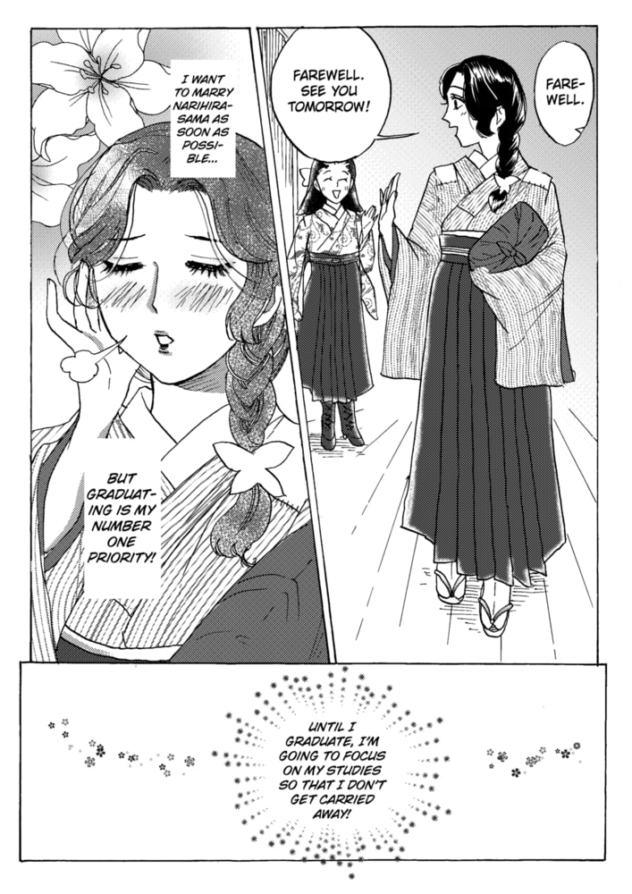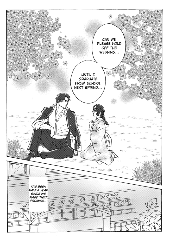 Using her status as a fallen aristocrat as the reason, female student Haru falls into a slump after being turned down by all of her suitors one after another. Her final suitor happens to be an officer in the army. In order to rebuild her childhood home, she is determined to ensure he doesn’t turn her down. Just as she strengthens her resolve, Warrant Officer Narihira appears on the scene riding on horseback. As he approaches, he asks her, “Will you marry me?” The instantly dismayed Haru delays her response, asking him to give her more time to consider. Passionate about her studies, the serious Haru is more than a little off-put by the warmongering soldier. Narihira continues to approach her ardently, which begins to sway Haru’s heart. Just as this is happening, as Narihira is escorting her home, he suddenly steals a kiss on her lips! Usually ever the gentleman, he gazes at Haru like a predator looks at its prey...