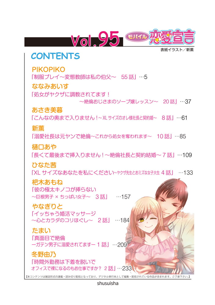 心もカラダも切なくなる 乙女のLOVE&Hコミック! モバイル恋愛宣言で大人気作品が登場!! 連載、読み切りの人気作品がもりだくさん♪ 最終回!! はなれていた時間を取りもどすように激しく求め合うふたり――。一晩で何回もイカされて…!? 新薫 「溺愛社長は元ヤンで絶倫~これから処女を奪われます~」 思い悩む椿に気づいた幸男。更衣室でやさしく愛撫してきて――。 PIKOPIKO 「制服プレイ~変態教師は私の伯父~」 招待されたパーティーで社長から癒してほしいと求められ…!? 冬野由乃 「時間外勤務は下着を脱いで オフィスで裸になるのもお仕事ですか?」 ひたすら愛してくれた社長を守るため杏が選んだ方法とは――。 樋口あや 「長くて最後まで挿入りません!~絶倫社長と契約結婚~」 …他(C)PIKOPIKO/ななみあいす/あさき美暮/新薫/樋口あや/ひなた茜/杷木あもね/やなぎりと/たまい/冬野由乃