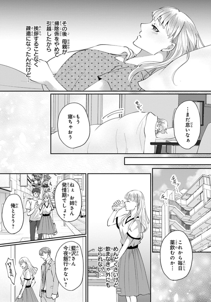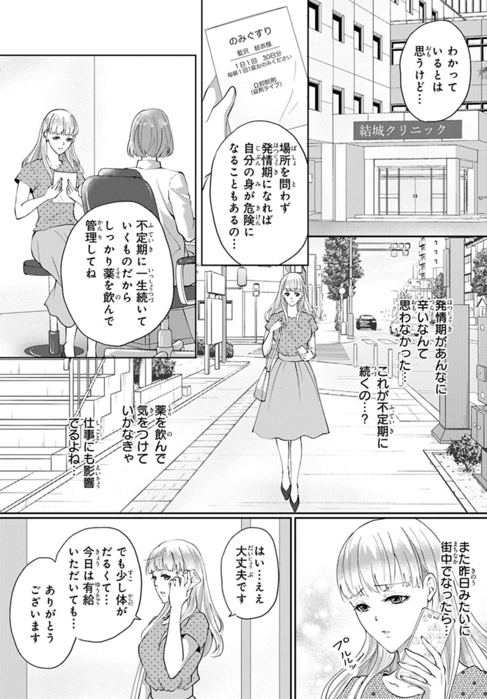 「お前の匂いが俺を発情させたんだ」26歳にして未だ発情期が来たことのないΩの藍沢結衣。仕事帰りの街中で突然発情期を迎えてしまい襲われそうになったところを柊和真に助けられる。結衣の幼なじみでαの和真と久しぶりの再会となったが、発情期のフェロモンにあてられた和真に抱かれてしまう!!疼く身体は抵抗できず、くちゅくちゅに濡れるナカは音を立てて和真を求めて…。挿入されただけでイッてしまう結衣を、奥までいっぱいに激しく突き立てる――発情期のあるΩとしての生活を不安に思う結衣に、和真が体裁を保つための契約番にならないかと提案してきて…!?