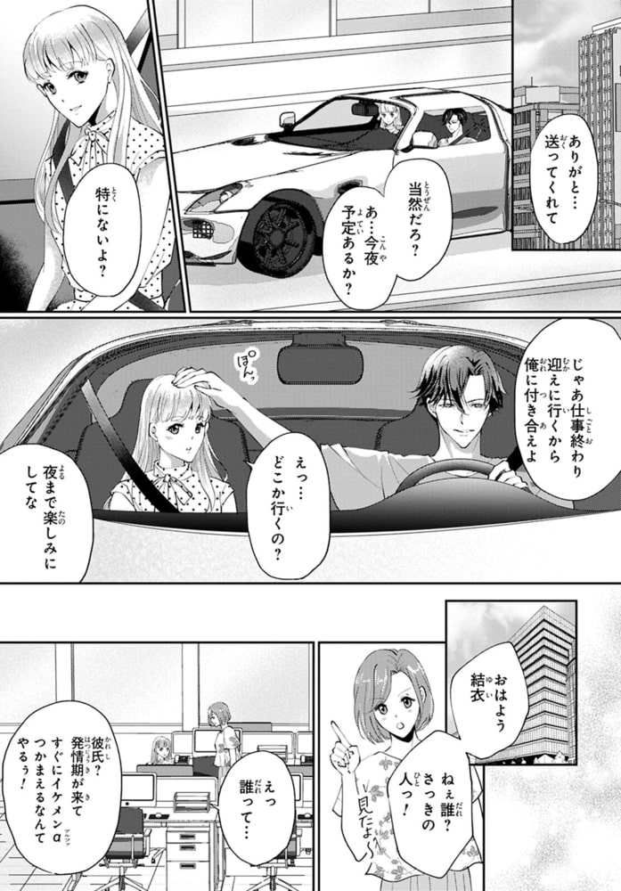 「お前の匂いが俺を発情させたんだ」26歳にして未だ発情期が来たことのないΩの藍沢結衣。仕事帰りの街中で突然発情期を迎えてしまい襲われそうになったところを柊和真に助けられる。結衣の幼なじみでαの和真と久しぶりの再会となったが、発情期のフェロモンにあてられた和真に抱かれてしまう!!疼く身体は抵抗できず、くちゅくちゅに濡れるナカは音を立てて和真を求めて…。挿入されただけでイッてしまう結衣を、奥までいっぱいに激しく突き立てる――発情期のあるΩとしての生活を不安に思う結衣に、和真が体裁を保つための契約番にならないかと提案してきて…!?