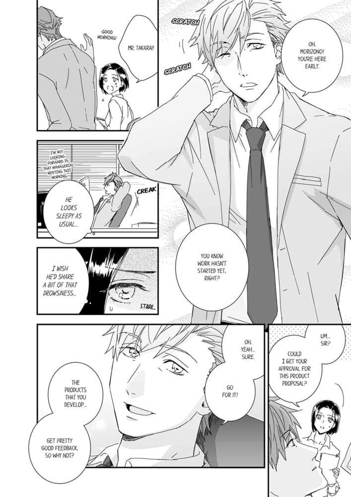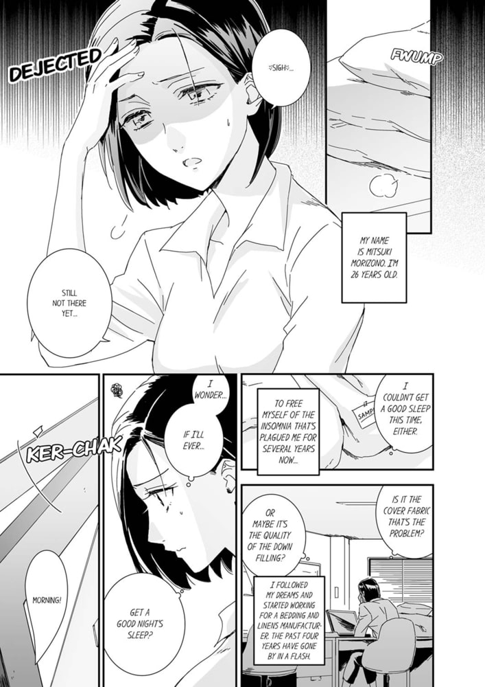 With his sweet voice, my boss whispered into my ear, "Tell me wherever it feels good, okay?" He's only giving me a massage to help ease me into a good night's sleep, but everywhere he touches feels like it's on fire. I work for a bedding and linens manufacturer. Thanks to my anxiety, I never get a good night's sleep. My boss, Mr. Takarai, on the other hand, always seems so well-rested. One day, after staying late at the office, my boss and I ended up messing around... which seemed to be the secret to a great night's sleep!? It all started with a massage to help me get to sleep, but it feels too good... I want him to touch me even deeper!!