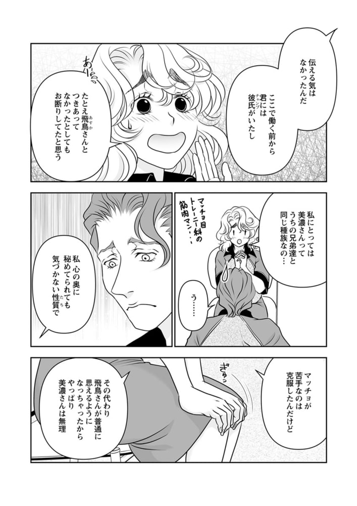 「大丈夫、怪物じゃない…私の身体だ。触ってみて…」力強いのに痛くない――そんな飛鳥さんの腕は、優しく私のカラダを包み込んで…外資企業の日本支社で働く23歳のOL・奈桜は、両親・兄弟ともに体を鍛えることが大好きな筋肉バカ家族の紅一点。筋肉だらけがうっとおしくて家を出て就職したものの、人員整理のため突然解雇され、再び実家へ戻ることに。だが、3兄弟に部屋を占拠されていたことに激怒し、家を飛び出すも、連れ戻しにきた兄・昴と言い合いになっていたところで、大学の准教授だという一人の紳士・氷守飛鳥(35歳)と出会う。その後、婚活で再会した二人は、お互いが気に入り付き合うことに。そして初めてのベッドイン…上着を脱いだ氷守の上半身を見た奈桜は、氷守のその見事すぎる筋肉に、思わず…!? 真面目な准教授が脱いだら凄い!? しかも中身も好戦的なんて聞いてない―――!?