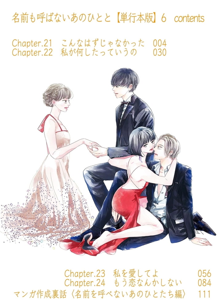 どうして?わけわかんないよ…。だって、そうたは私と付き合ってて…いくみはそれを知ってたのに。目の前で2人の裏切り行為を見てしまったかなこは、そうたとどう接して良いかわからず、会社で会っても避けてしまう。一方そうたも、いくみにされた事がトラウマとなり、かなこに触れる事が出来なくなる。そんな中、いくみの更なる計画は進行中で、彼女は妊娠を偽装する。しかしいくみの企みに気付いたえいじは…。大人気コミック『名前も呼ばないあのひとと』が単行本版で登場!第6巻はChapter.21~24までを収録。巻末に作中裏話の描き下ろしショート漫画あり!