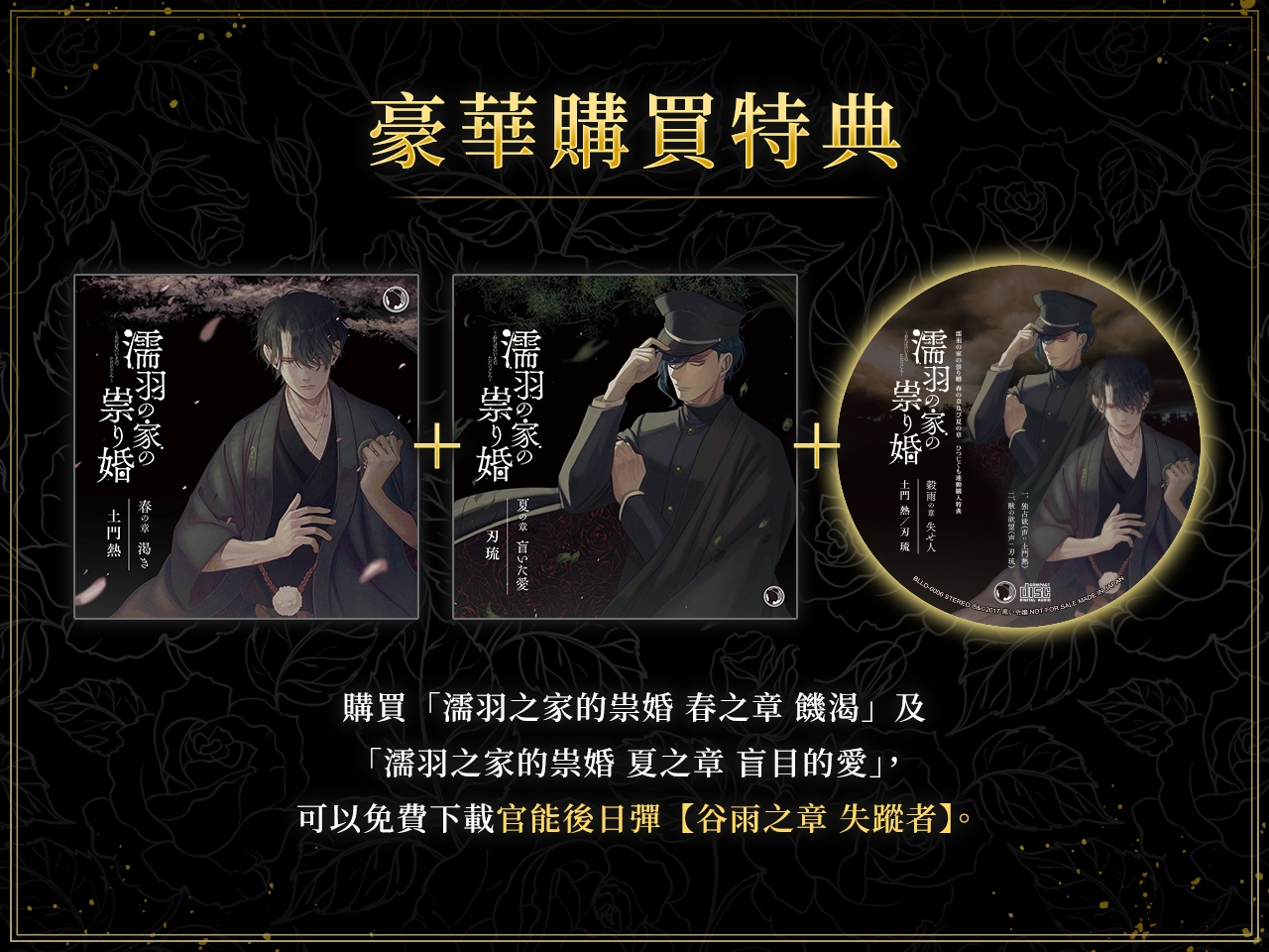 「濡羽之家的祟婚」是自2017年7月起每月連續發售,全篇共四卷的成人女性向情景Drama CD。