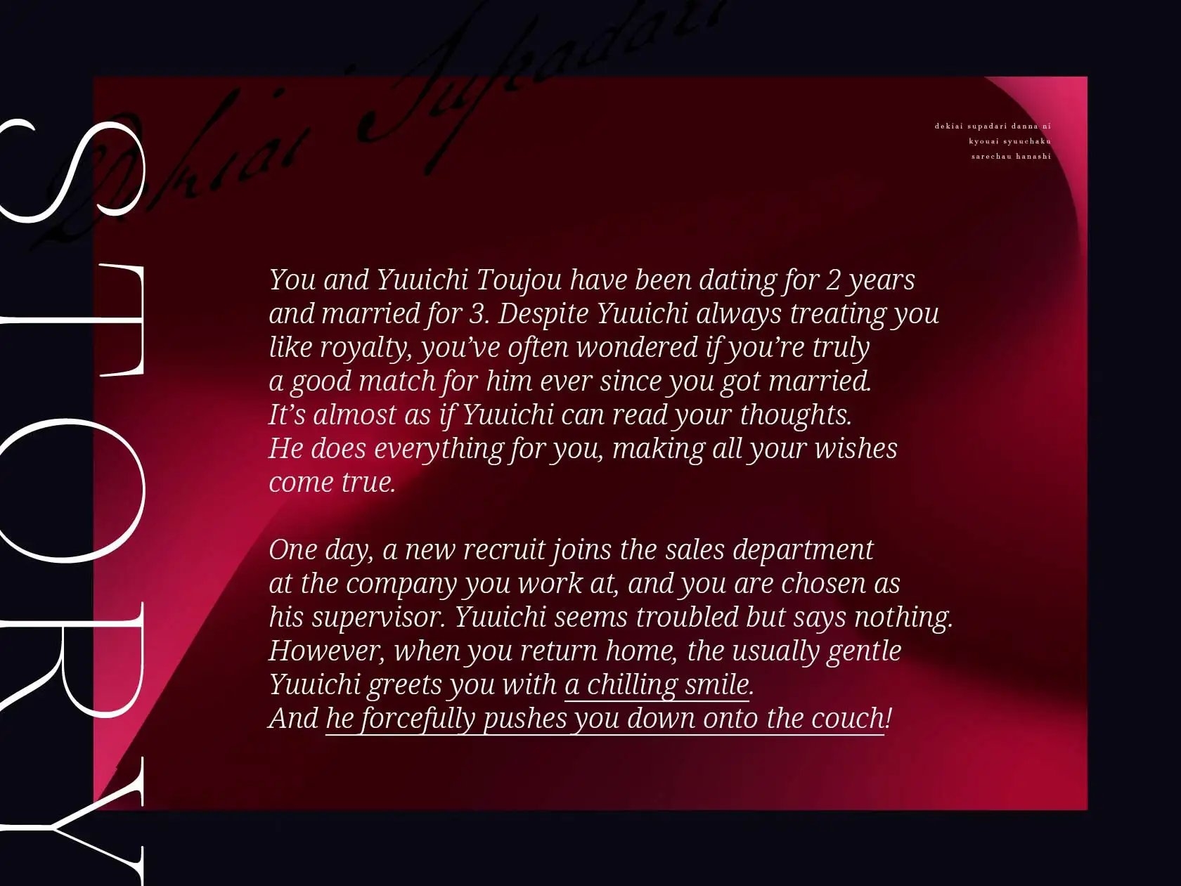 優一の妻。優一と同じ職場で営業事務。自分が優一と釣り合っていると思ってないので、優一と結婚してることを公にしたくない。優一には黙ってもらっている。いつも優しくしてくれている優一が大好き。最近、誰かの視線を感じていることがあるが、あまり気にしないようにしている