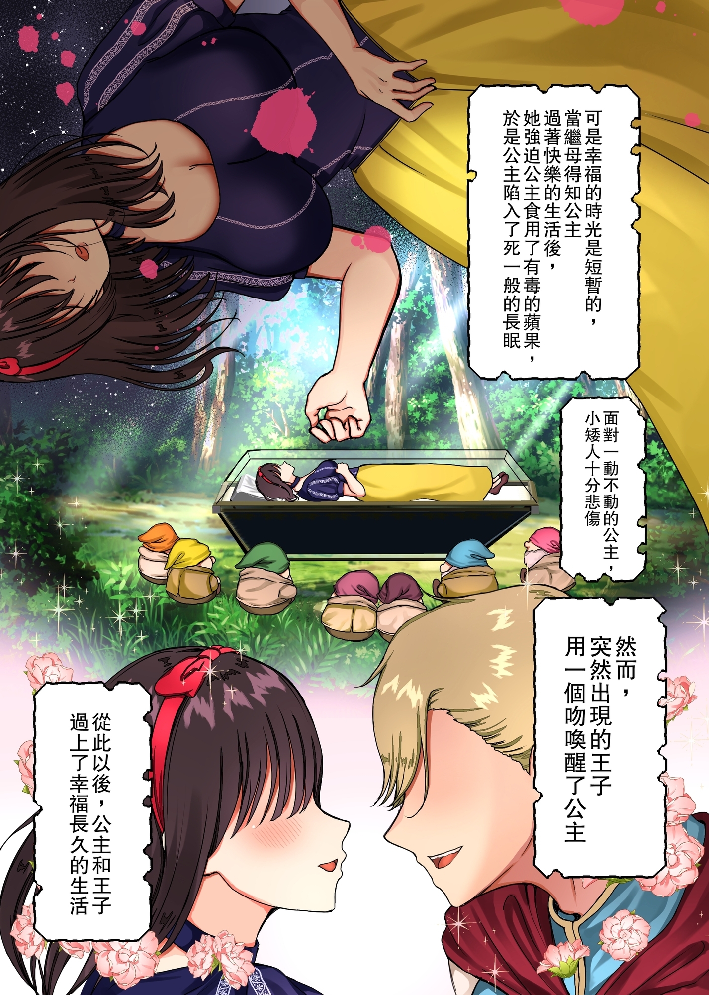 そんな姫への秘めた想いに駆られた小人達は時間を戻す魔法の探究のみならず、王子に勝る男になるために筋肉増強剤の開発、度重なる整形、ホルモン剤の投与…
