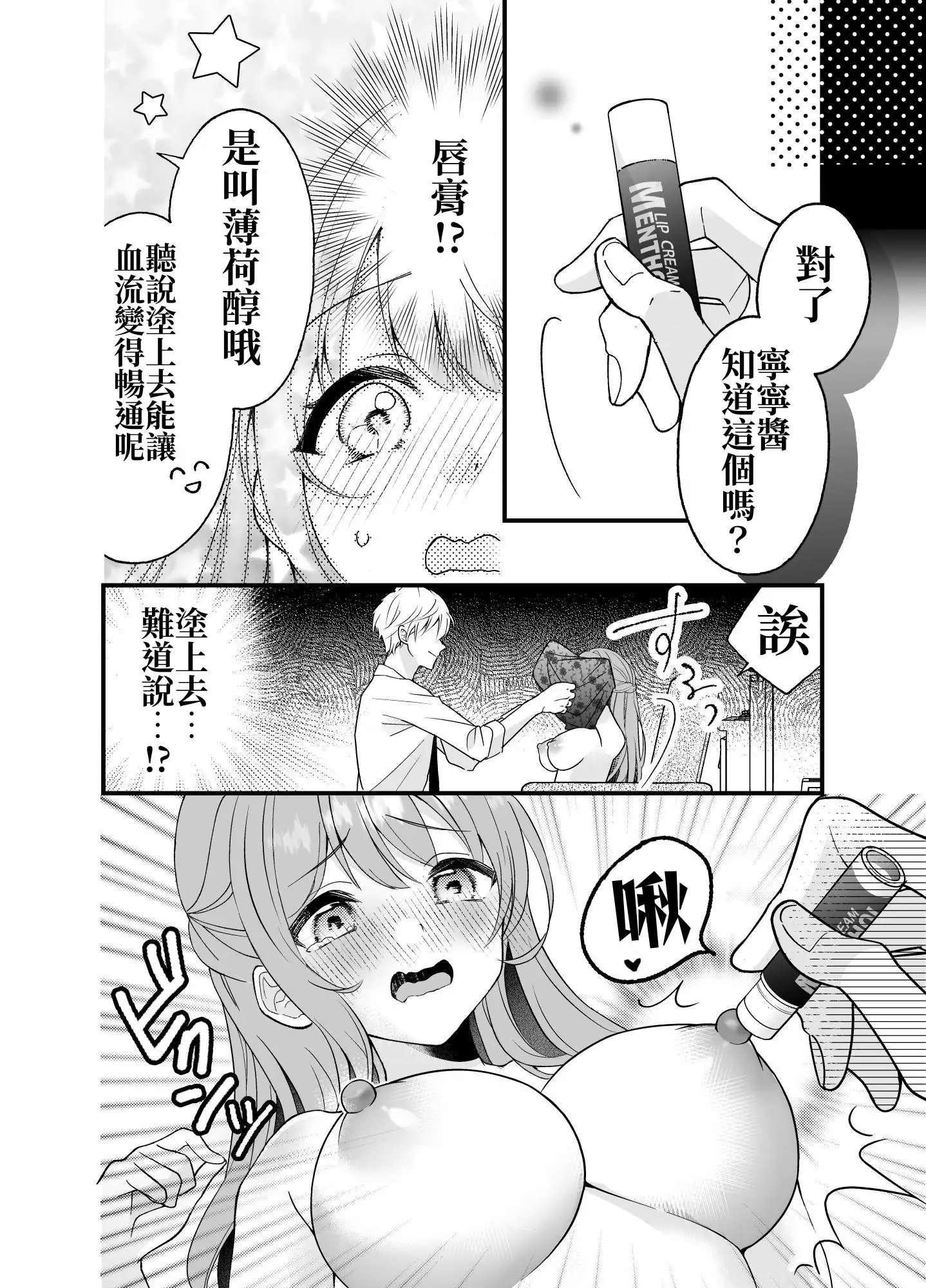 ごまかそうとする主人公を、意地悪なマッサージで責め始める春彦。スースーする成分のリップクリームを乳首とクリに塗りたくり、敏感になった部分を指と舌で執拗にいじめられる。