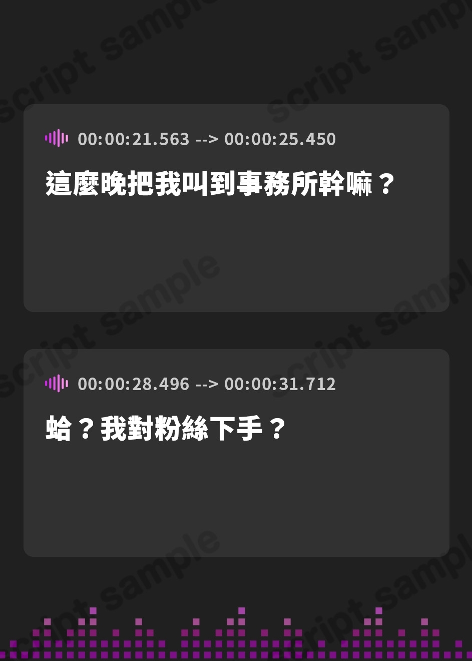 俳優としては絶好調の隼人だったが何度も女性問題を起こしていたので、釘を指すため事務所に呼び出すあなた。しかし隼人は人気のない事務所の様子を見て、セックスしようと言い出し…