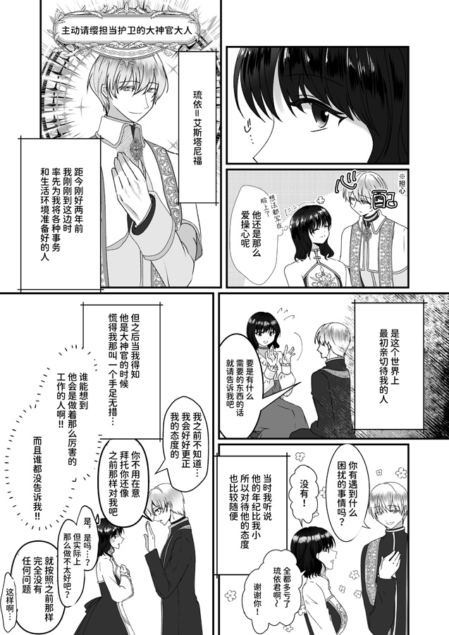 この世界に来てからずっと親切にしてくれた神官、リューイ・エスタニエフの事を想いつつも、自分がこのまま かのん の付き人として生きていていいのか、一人で生きていく方が良いのか悩んでいた。