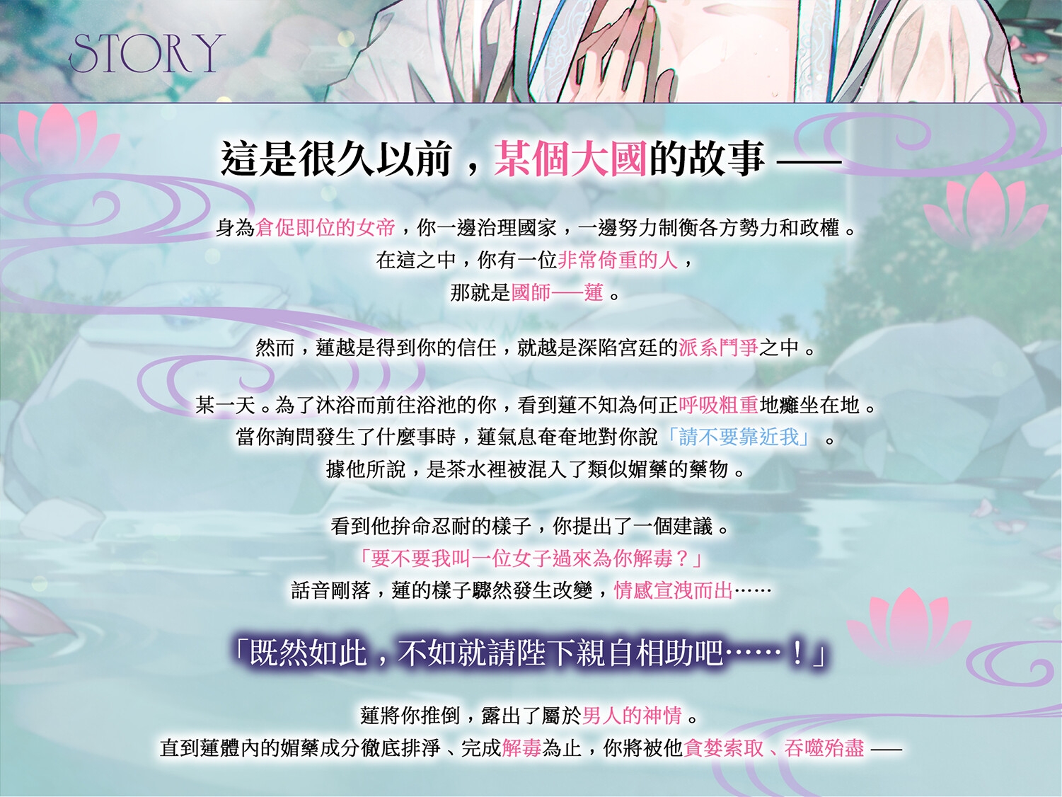 為了沐浴而前往浴池的你,看到蓮不知為何正呼吸粗重地癱坐在地。當你詢問發生了什麼事時,蓮氣息奄奄地對你說「請不要靠近我」。