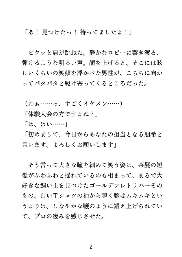 そこであなたを待っていたのは、人懐っこい笑顔を浮かべる犬系のイケメントレーナー・朋希(ともき)だった。