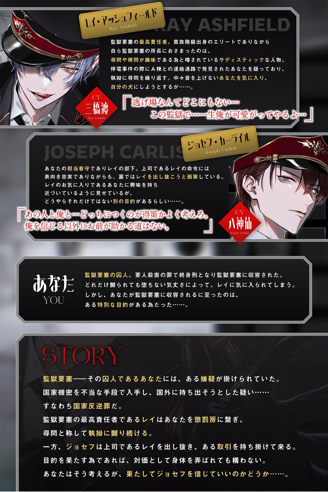あなたの担当看守でありレイの部下。上司であるレイの命令には表向き忠実でありながらも、裏ではレイを出し抜こうと画策している。レイのお気に入りであるあなたに興味を持ち近づいているように見せているが、どうやらそれだけではない別の目的があるらしい……。