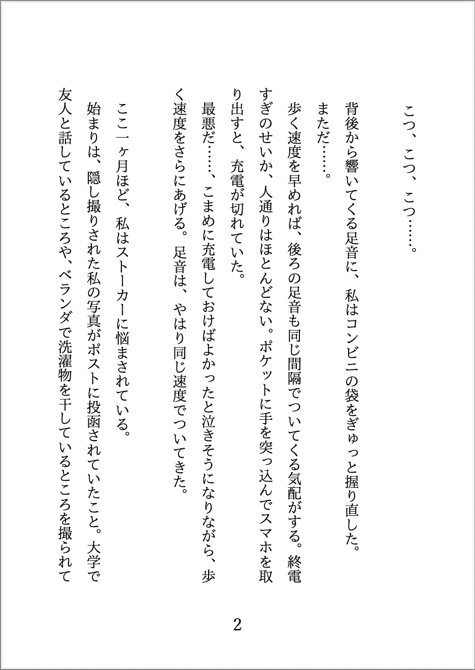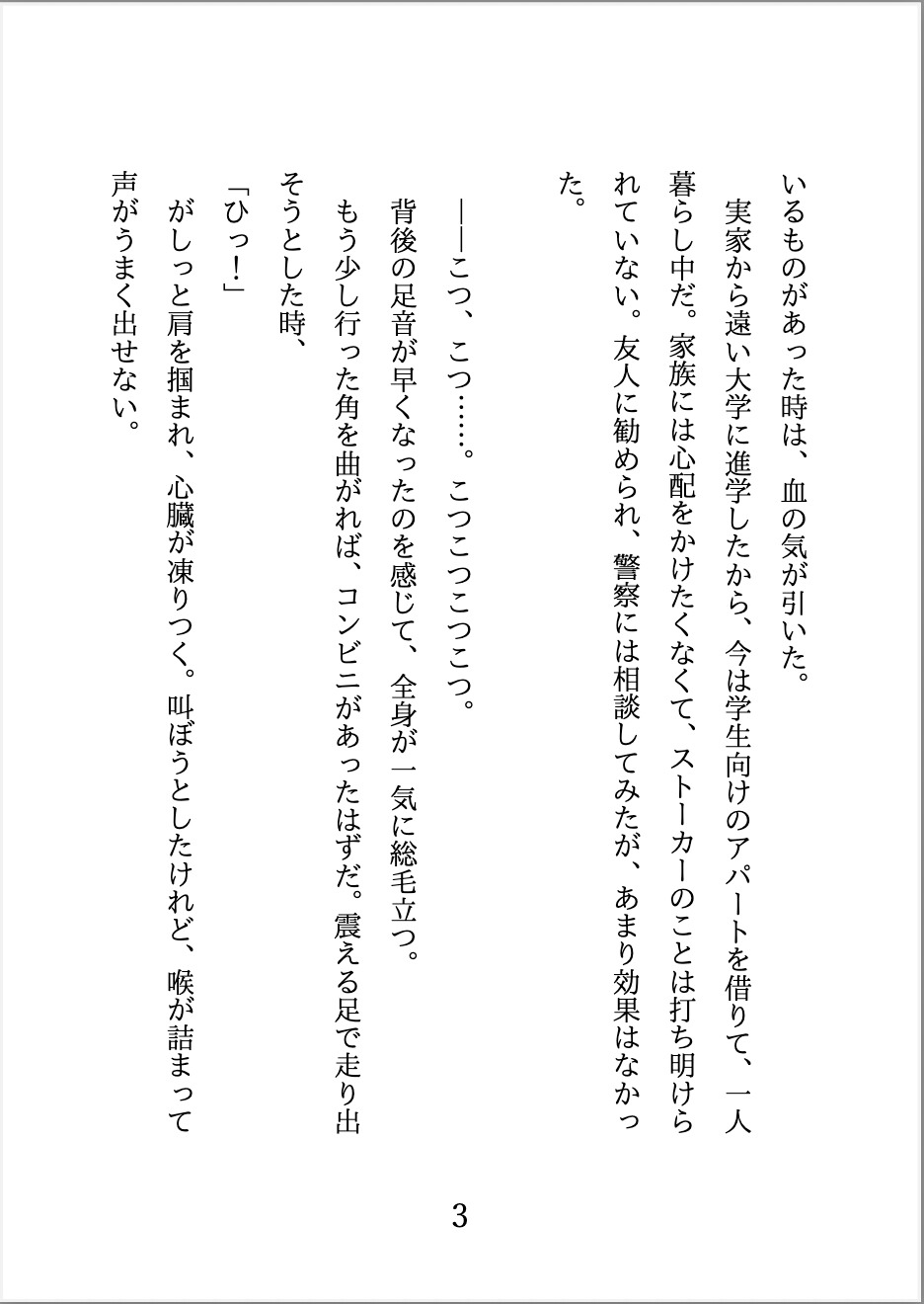 ストーカー被害に悩む大学生のわたしは、ある夜、終電すぎの帰り道でひとりの男に肩を掴まれる。