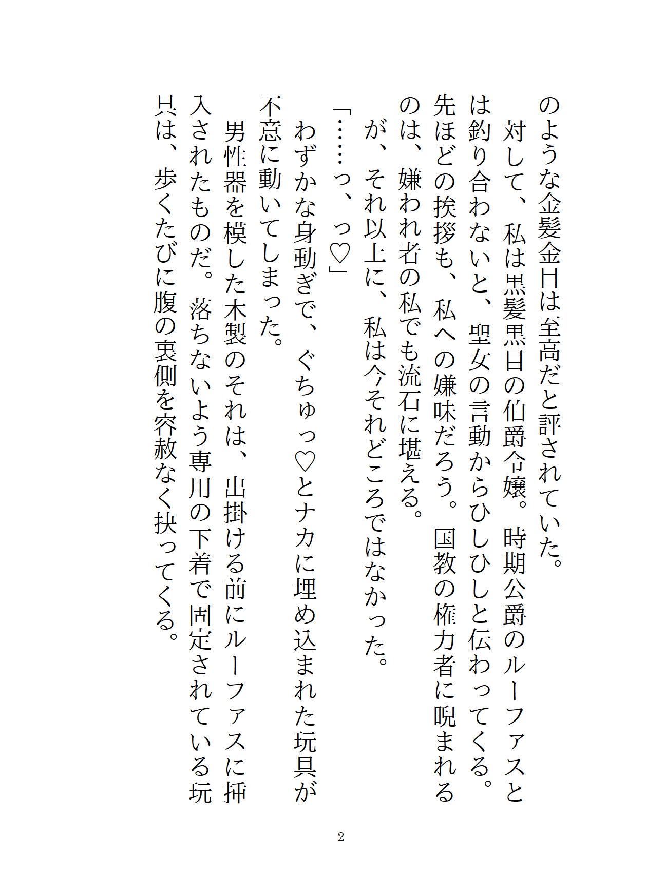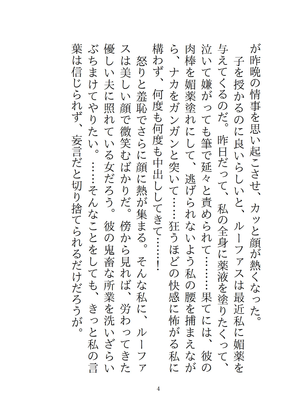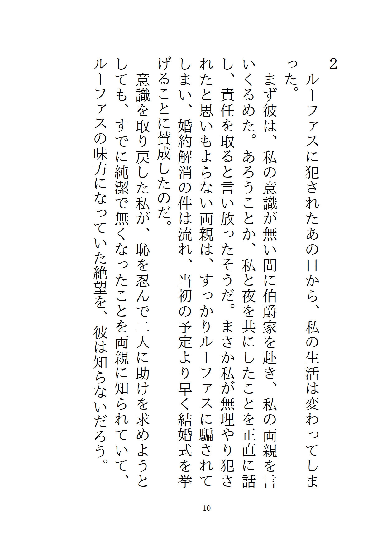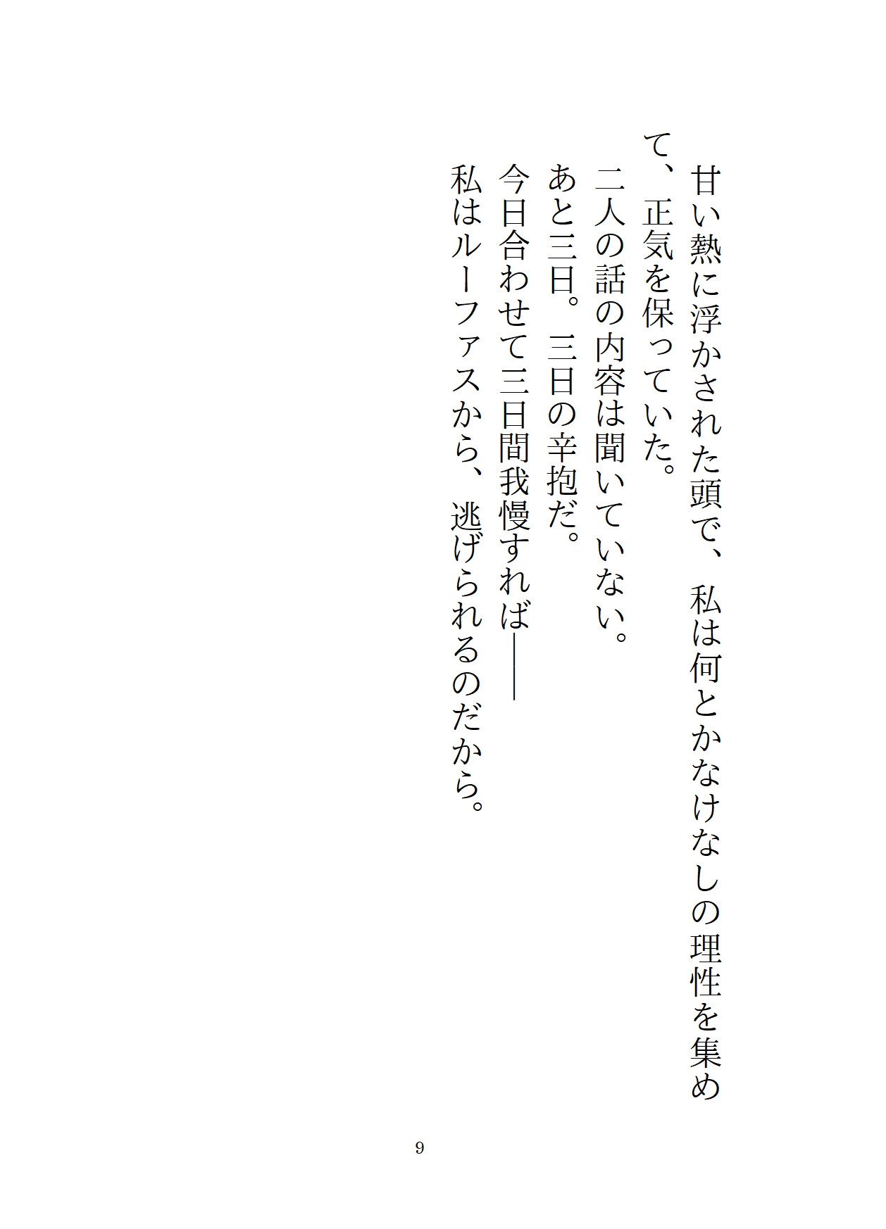 主人公がルーファスに犯されたその後。彼によって外堀を埋められた主人公は、ルーファスの買った屋敷に住まわされていた。軟禁紛いの生活に、主人公はルーファスの愛は間違っていると思い、屋敷からの逃亡を決意する。一見従順なフリをしていながら、半年後。結婚式の三日目に、ルーファスは第四王子の誘いを断れず、女人禁制の社交クラブに参加することに。このチャンスを見逃さず、主人公は船で国外へ逃げるため、変装して港へ向かう。だが、そこには社交クラブに出かけたはずのルーファスがいて、「逃がすつもりなんてない」と彼女を屋敷に連れ戻し……!?