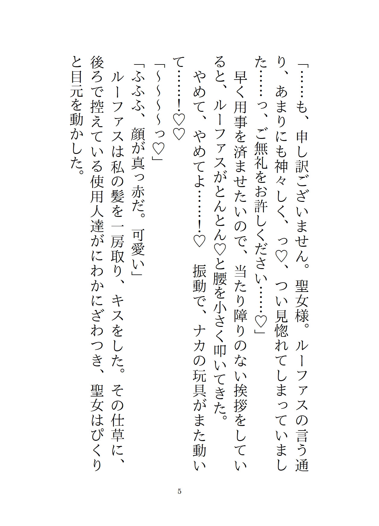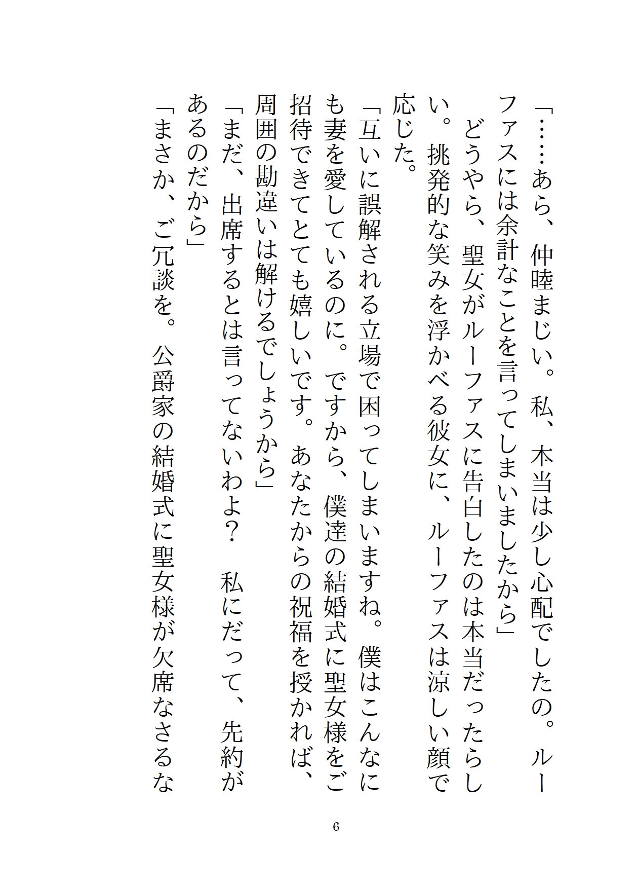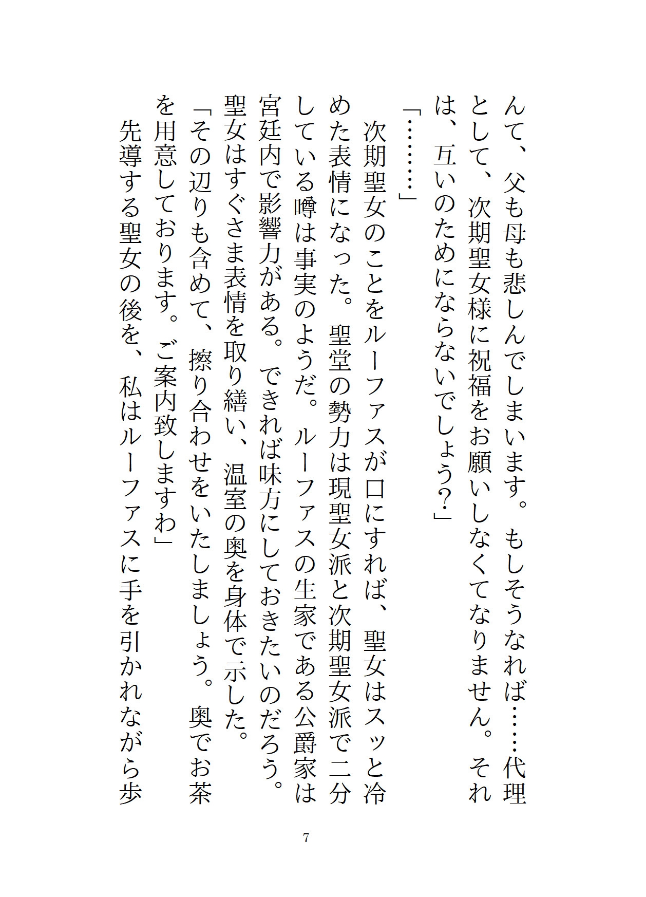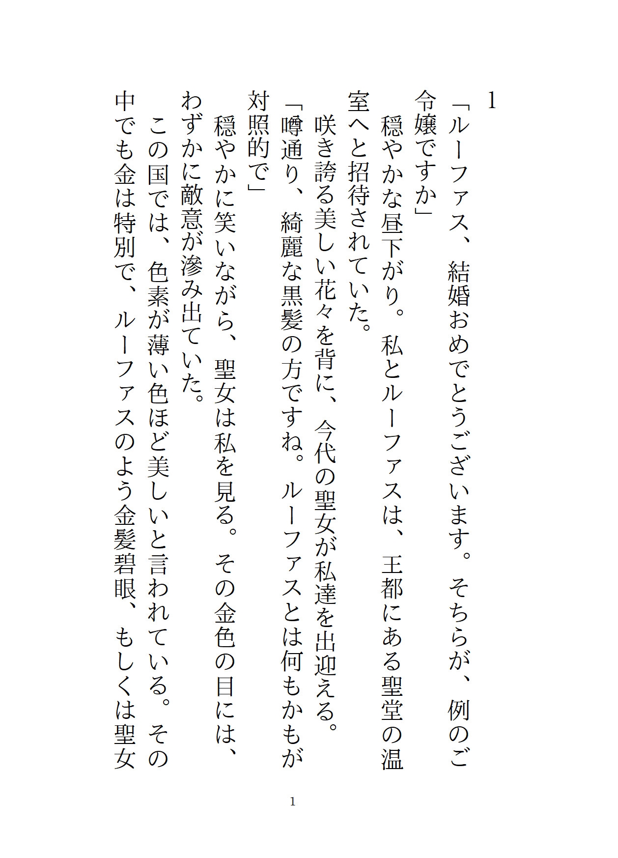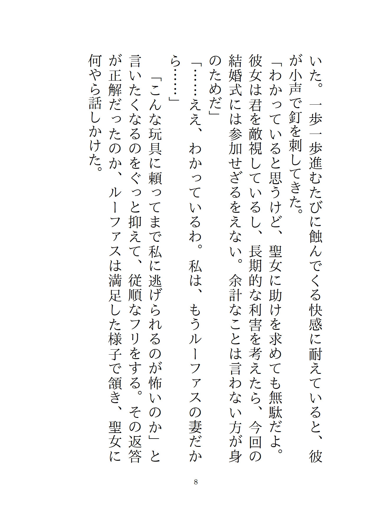 主人公がルーファスに犯されたその後。彼によって外堀を埋められた主人公は、ルーファスの買った屋敷に住まわされていた。軟禁紛いの生活に、主人公はルーファスの愛は間違っていると思い、屋敷からの逃亡を決意する。一見従順なフリをしていながら、半年後。結婚式の三日目に、ルーファスは第四王子の誘いを断れず、女人禁制の社交クラブに参加することに。このチャンスを見逃さず、主人公は船で国外へ逃げるため、変装して港へ向かう。だが、そこには社交クラブに出かけたはずのルーファスがいて、「逃がすつもりなんてない」と彼女を屋敷に連れ戻し……!?