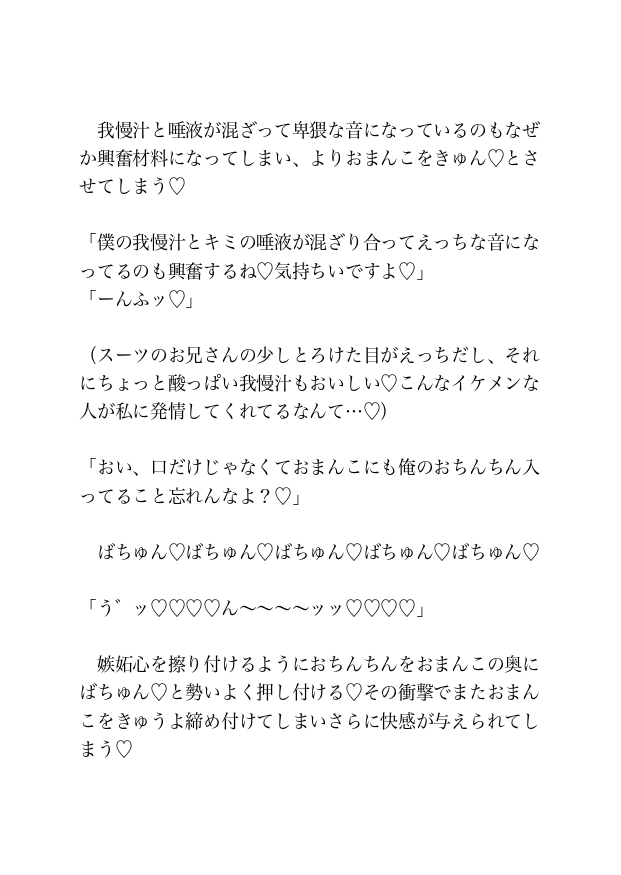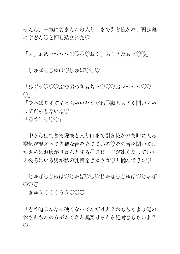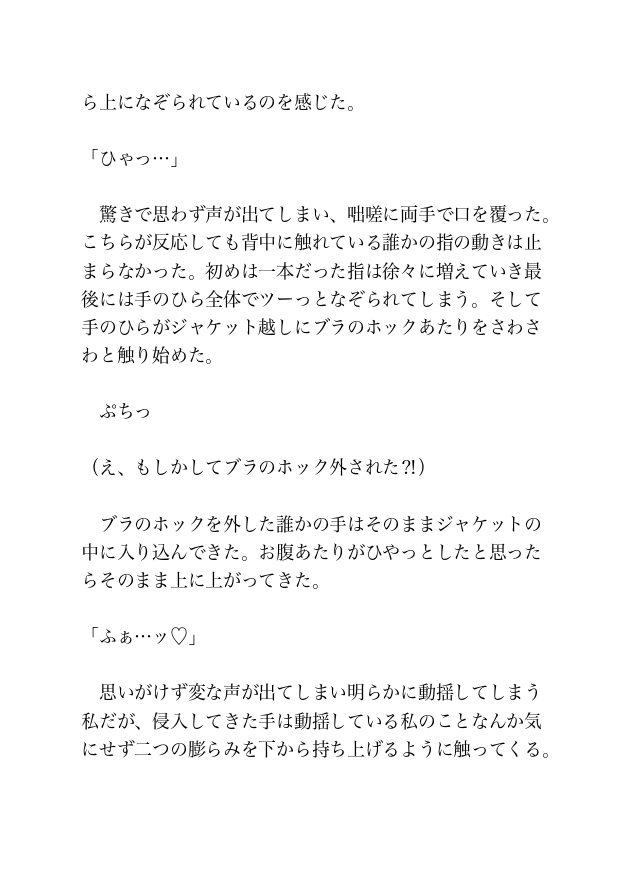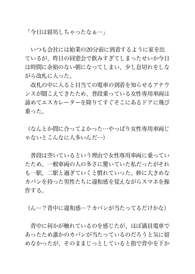 満員電車の熱気の中、背後から忍び寄る指先がブラのホックを弾き、ジャケットの中に熱い手が滑り込む。二人の男に前後を挟まれ、同時に責め立てられる「私」だったが、会社の最寄り駅に到着したことを知らせるアナウンスを聞いて電車から飛び降りた。