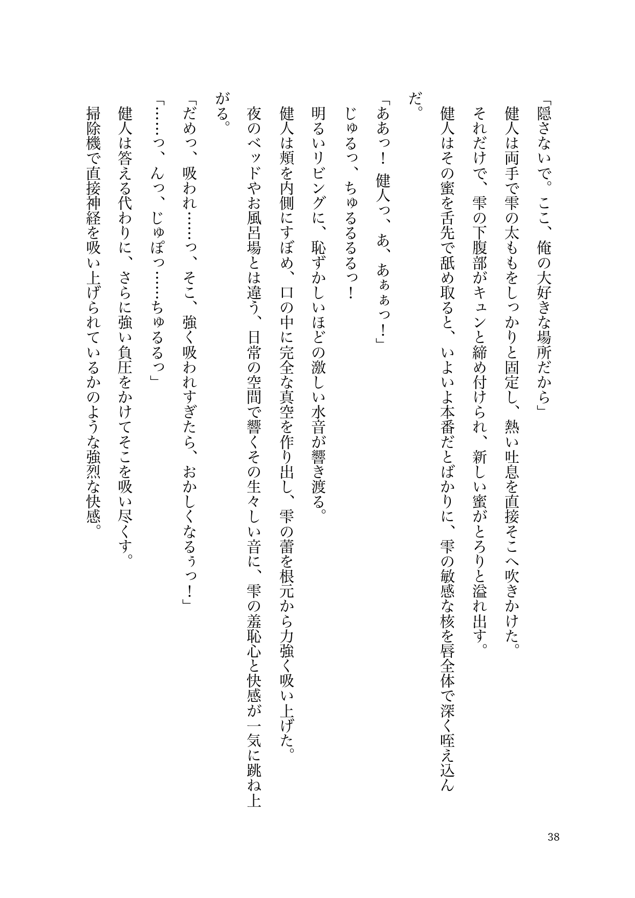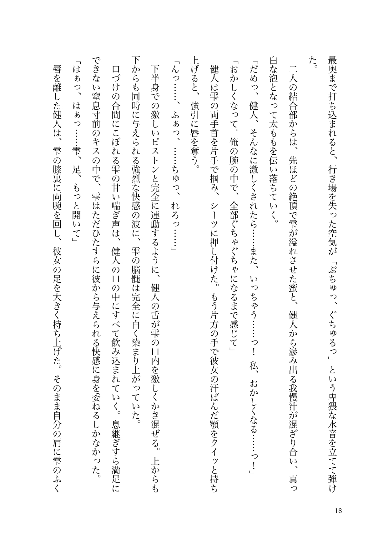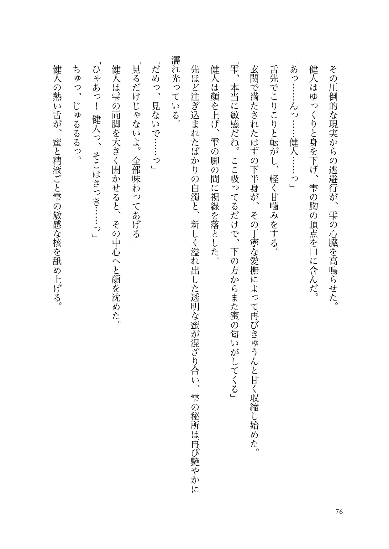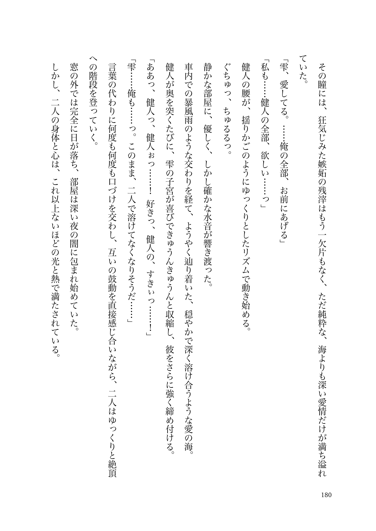 キャンパスで他の男の視線に晒されただけで嫉妬に狂い、理性ごと吹き飛んでしまう健人。外の世界から完全に隔離された絶対的な安全地帯で、彼は理不尽なほどの愛撫と容赦のない快感で、雫の心と身体を自分の形に作り替えていく。どんなに激しく貫かれても、どんなに理性を溶かされても、健人からの重すぎる愛を全身で受け止めることに、雫もまた抗えない悦びを感じていた。