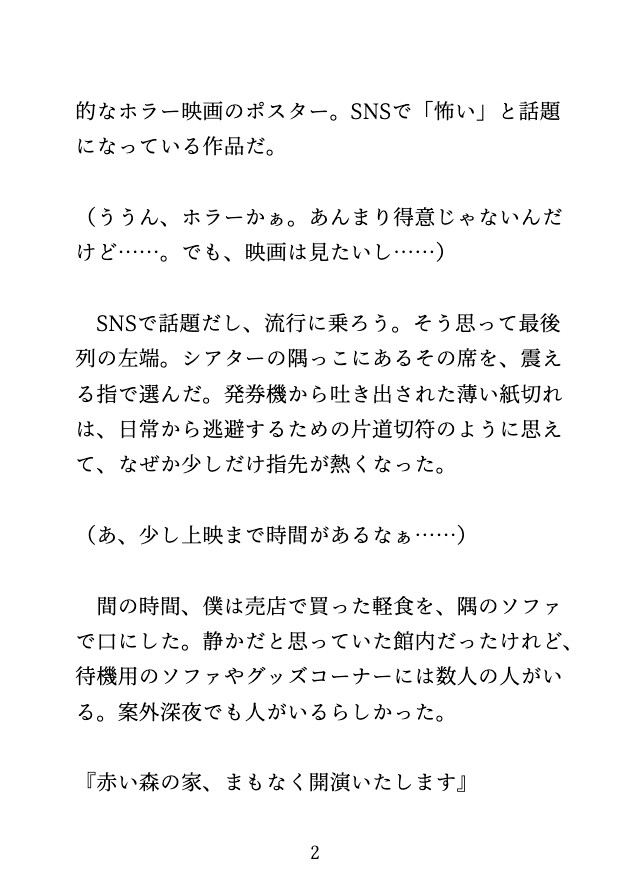 仕事帰りに訪れた、深夜の映画館。 SNSで話題のホラー映画を選んだあなたは、静まり返ったシアターの最後列へと向かう。