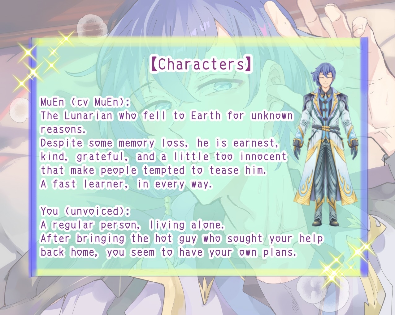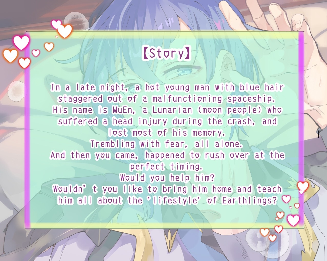 In a late night, a hot young man with blue hair staggered out of a malfunctioning spaceship. His name is MuEn, a Lunarian (moon people) who suffered a head injury during the crash, and lost most of his memory.