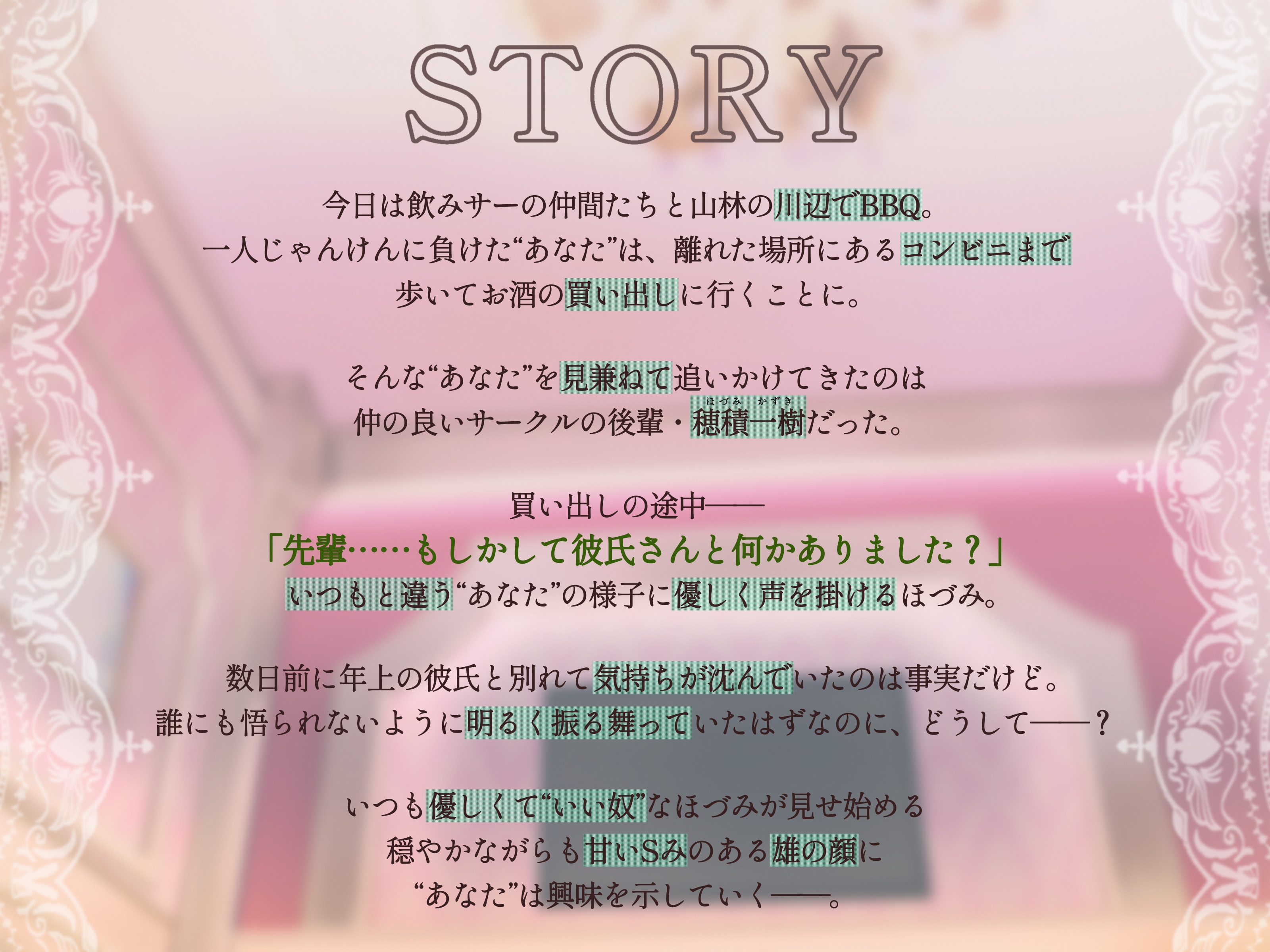 とあるアレルギーで長年悩んでいた“あなた”は自身の誕生日をきっかけに親しくなった職場の後輩・青柳優生に悩みを打ち明けることに。今まで異性として意識していなかった青柳に全身をよしよし撫でられながら優しく導かれ、憧れていた恋人同士のイチャイチャえっちに溺れていく。CV.速水理人