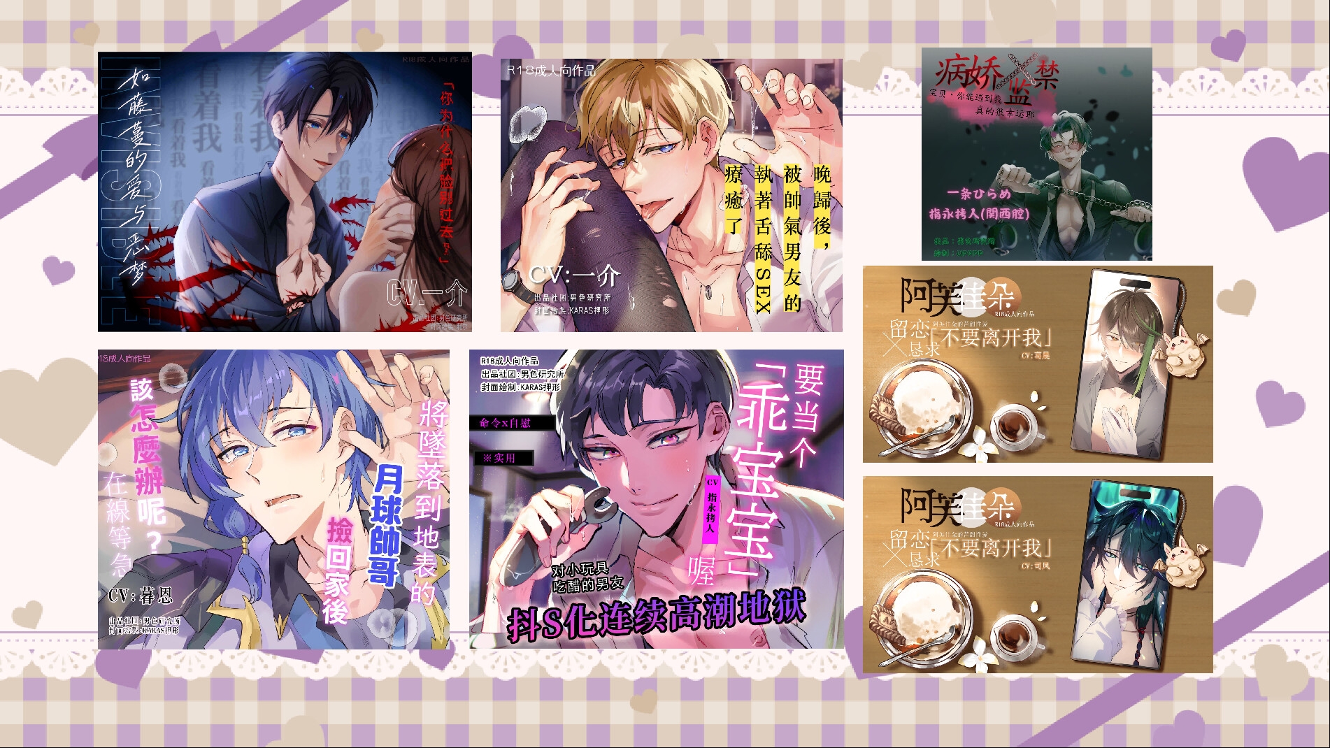 这是一个制作给大人的女性向R18音声社团,制作从纯爱、恶搞、幻想到黑车的色色ASMR作品! 以日本R18音声作品的规格进行中文作品的制作。