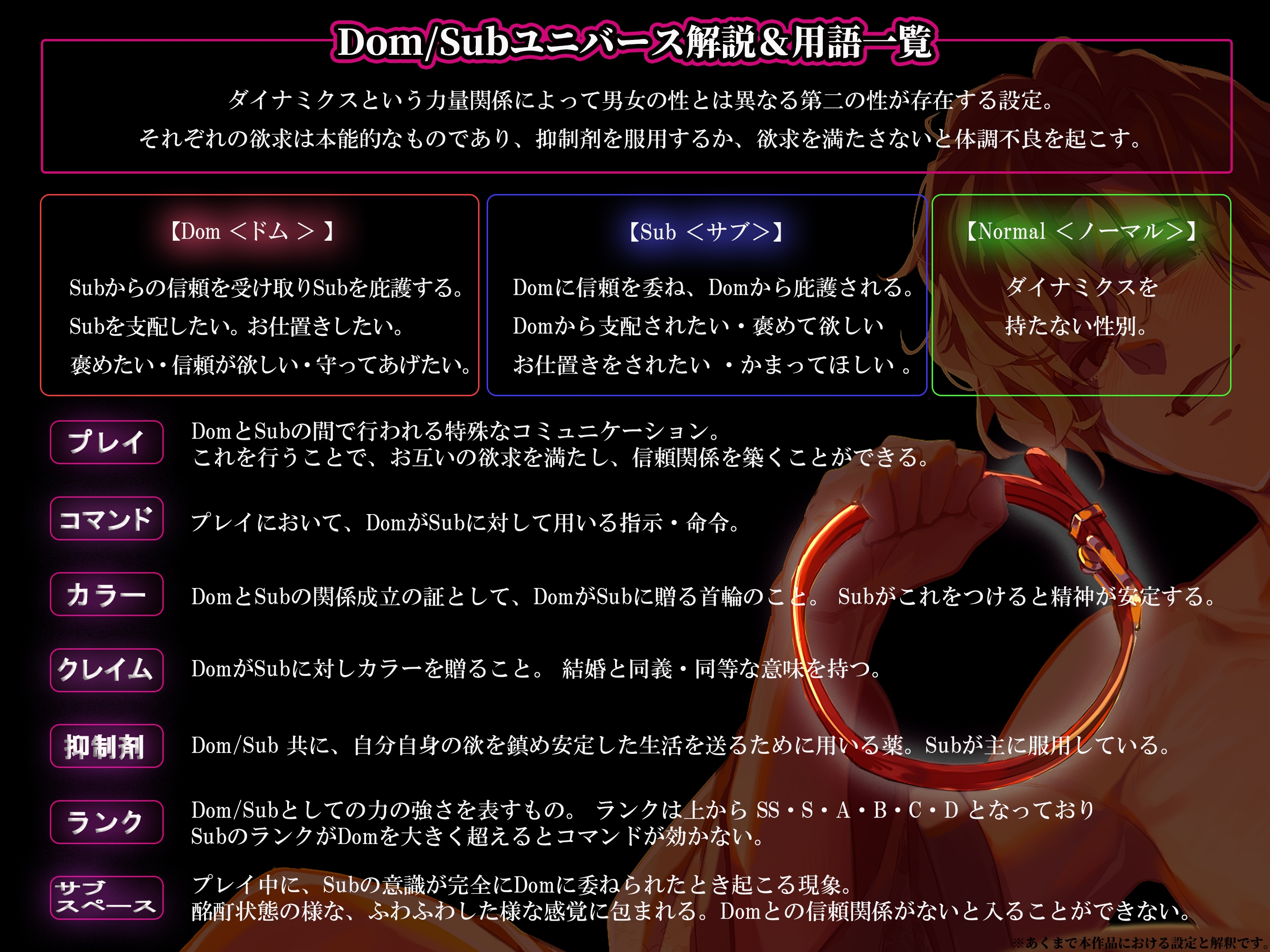 ダイナミクスという力量関係によって男女の性とは異なる第二の性(Dom/Sub等)が存在する設定。