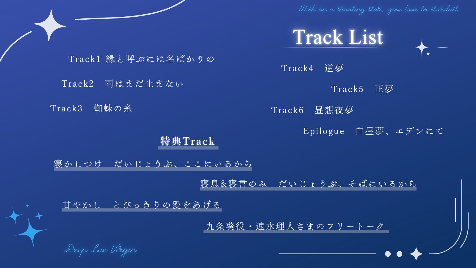 ![流星に願いを、星屑には愛を [深愛VIRGIN] 流星に願いを、星屑には愛を [深愛VIRGIN]](http://img.dlsite.jp/modpub/images2/parts/RJ01487000/RJ01486325/d40212c012a5e1d0cd55afcb837283ab.jpg)