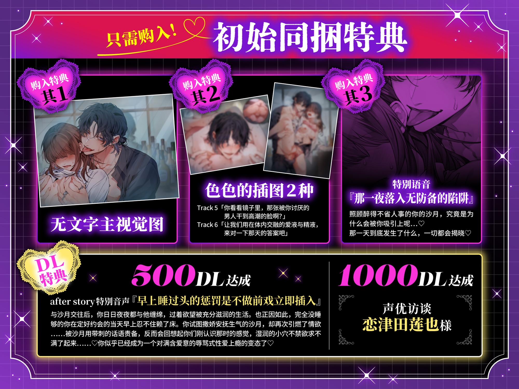 与沙月交往后,你日日夜夜都与他缠绵,过着欲望被充分滋润的生活。也正因如此,完全没睡够的你在定好约会的当天早上忍不住赖了床。你试图撒娇安抚生气的沙月,却再次引燃了情欲……被沙月用带刺的话语责备,反而会回想起你们刚认识那时的感觉,湿润的小穴不禁欲求不满了起来……♡你似乎已经成为一个对满含爱意的辱骂式性爱上瘾的变态了♡