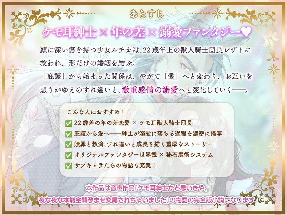 本作品は音声作品「ケモ耳紳士かと思いきや、夜な夜な本能全開孕ませ交尾されちゃいました」のストーリーの完全版小説です。