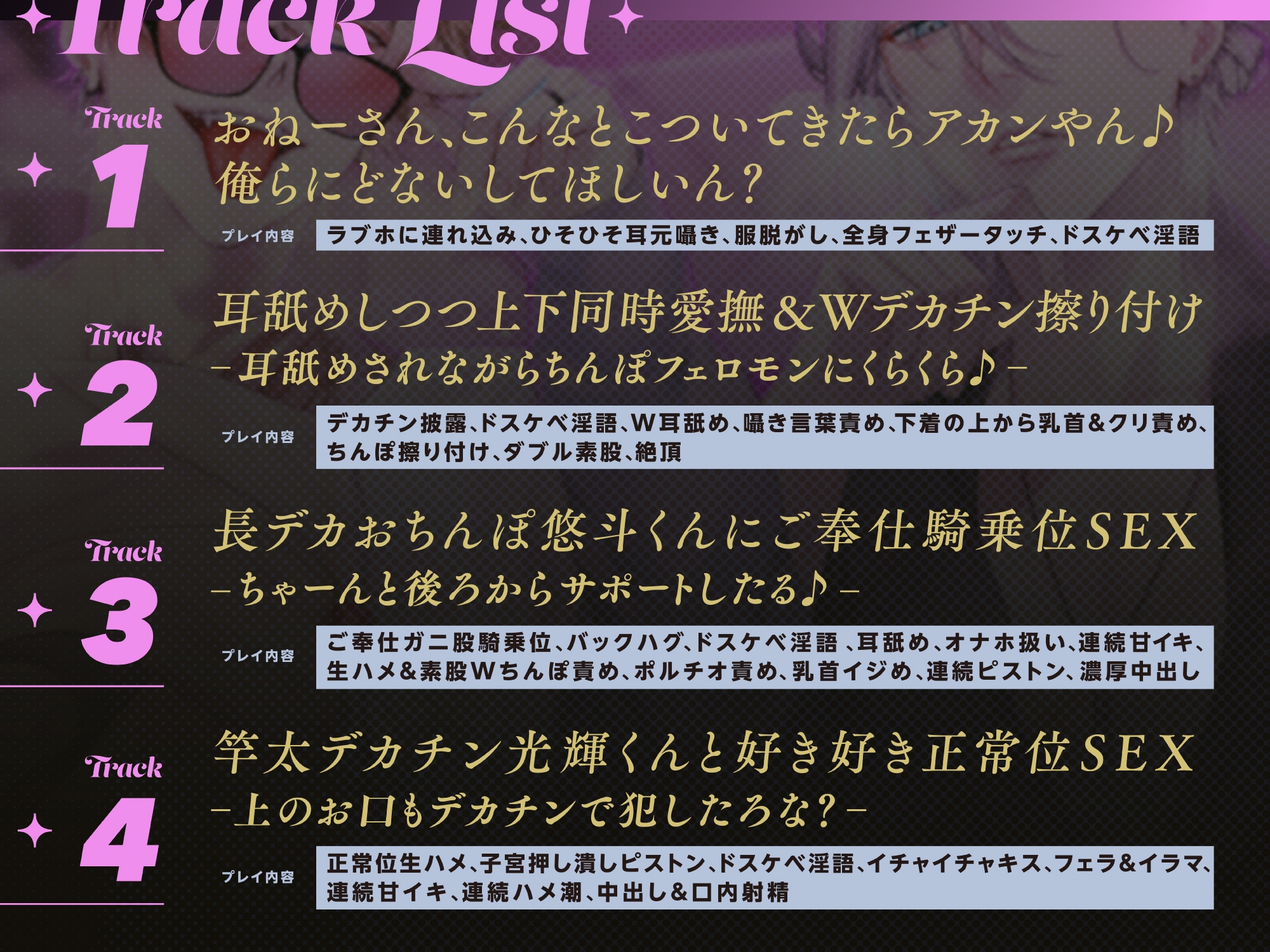 プレイ内容:デカチン披露、ドスケベ淫語、W耳舐め、囁き言葉責め、下着の上から乳首&クリ責め、ちんぽ擦り付け、ダブル素股、絶頂