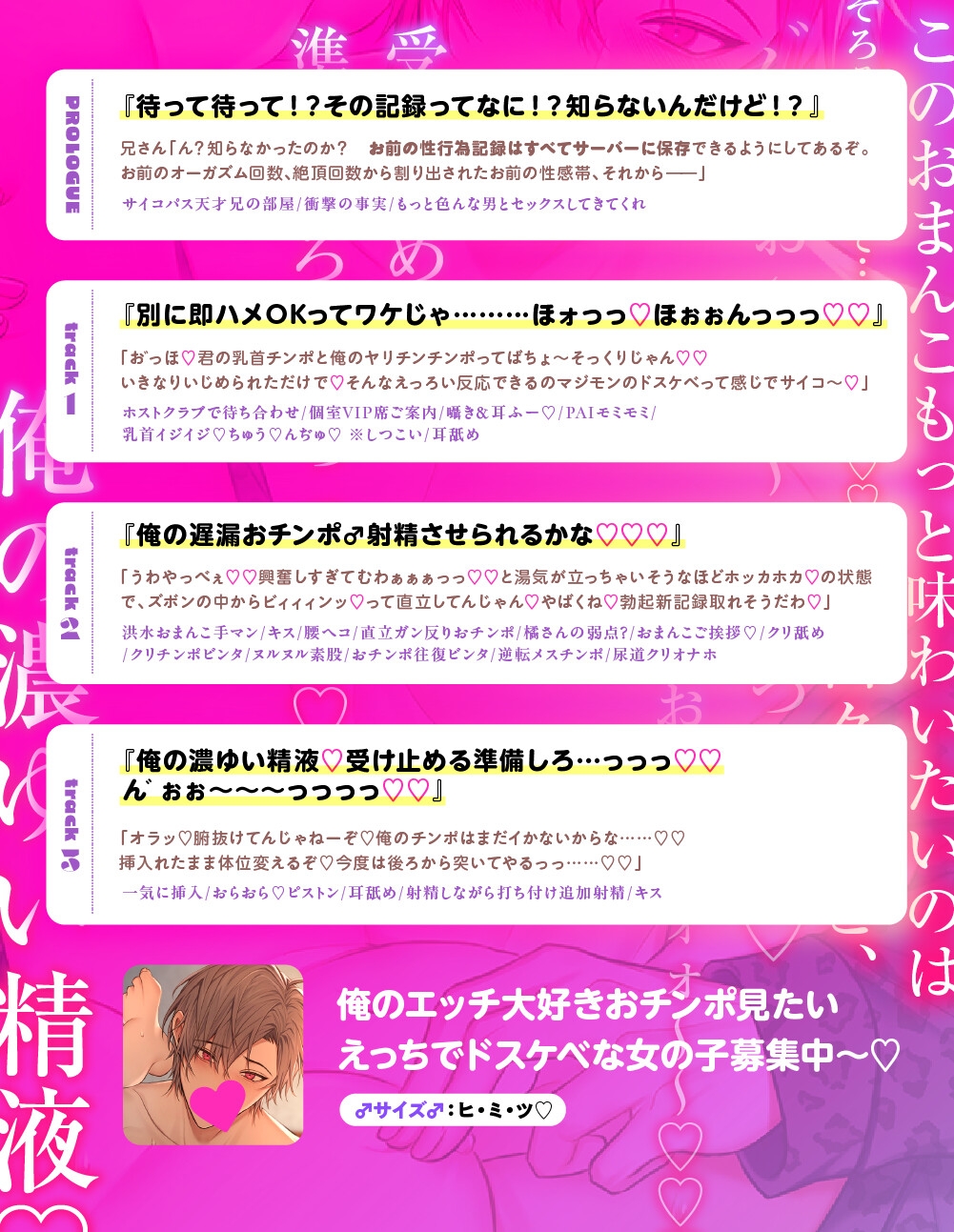 ![【貴女の運命ドスケベ蜜蜂♂を探せっ】オラつきヤリチン経営者と即結合★連続絶頂オホ声どしゅけべ♂♀怒涛の杭打ちピストン♂ぶっぽ♡ぶっぽぉぉぉ~~~っっっ♡♡♡♡ [えっち♥ぷれいリスト] 【貴女の運命ドスケベ蜜蜂♂を探せっ】オラつきヤリチン経営者と即結合★連続絶頂オホ声どしゅけべ♂♀怒涛の杭打ちピストン♂ぶっぽ♡ぶっぽぉぉぉ~~~っっっ♡♡♡♡ [えっち♥ぷれいリスト]](http://img.dlsite.jp/modpub/images2/parts/RJ01531000/RJ01530269/7a7846d45a27c9db8ab7e05ece4f60af.jpg)