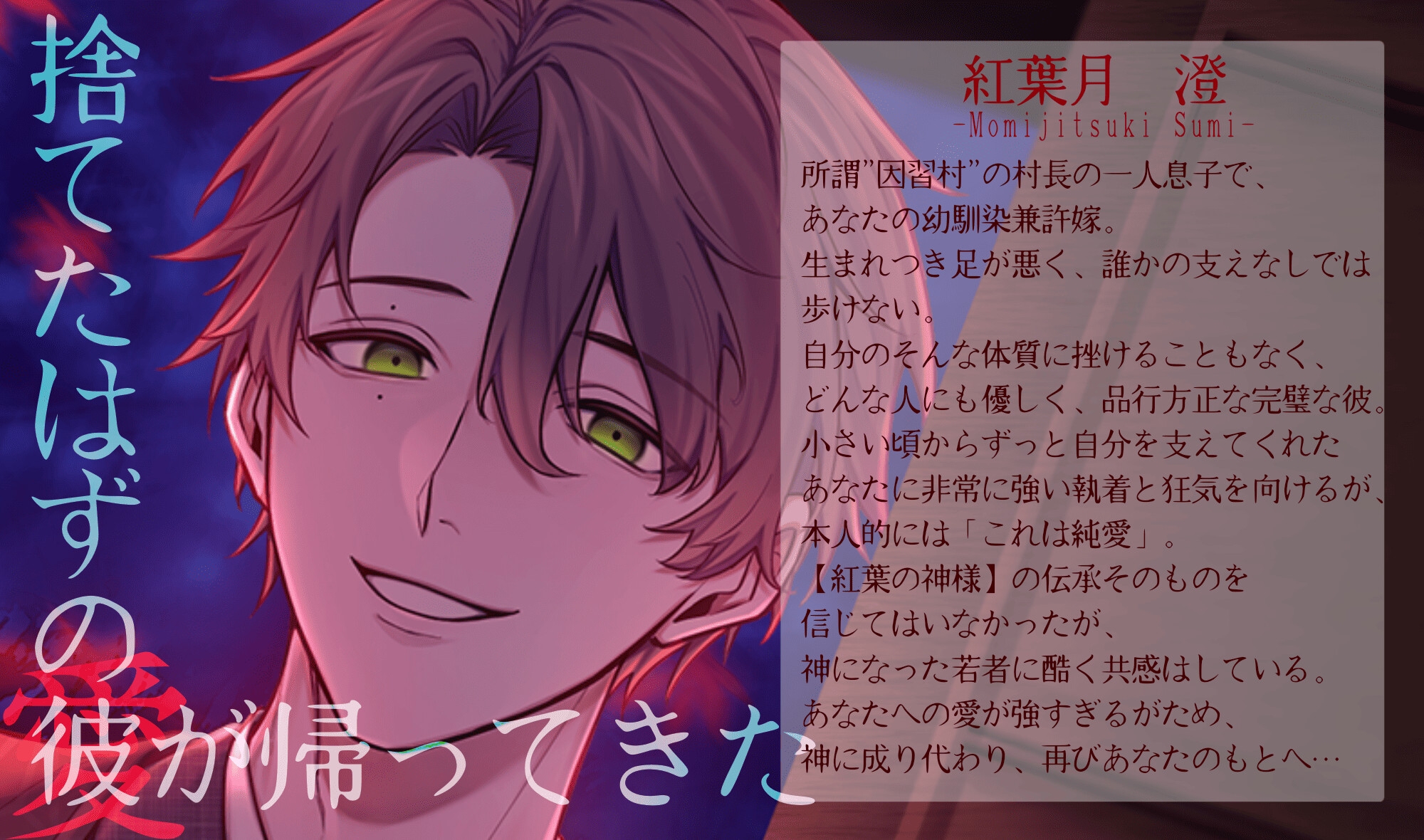 一人の旅の娘に恋をし、執着故に彼女を亡くしてしまった若者が神になったという伝承が残る、いわゆる”因習村”で生まれ育ったあなた。