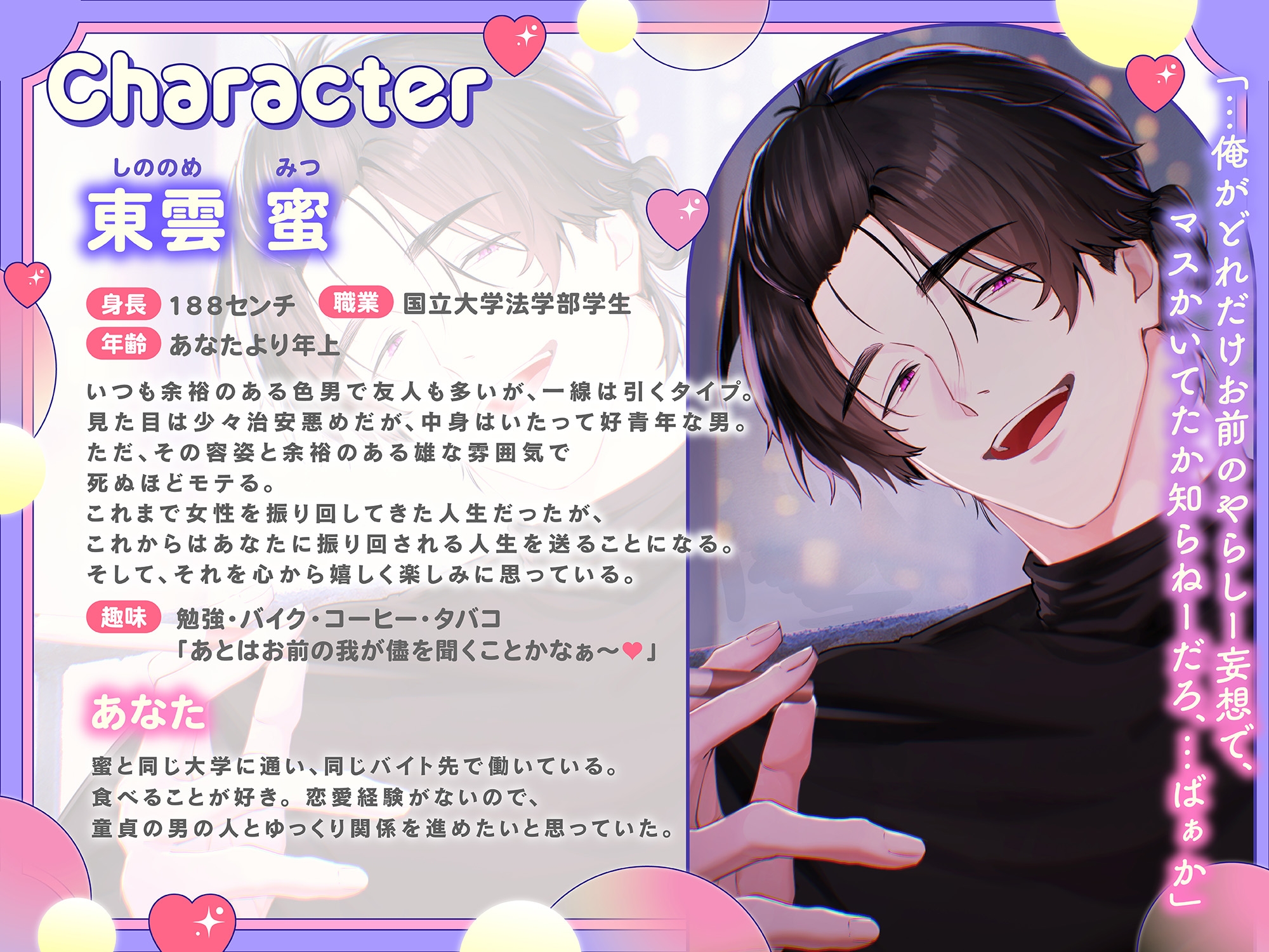 いつも余裕のある色男で友人も多いが、一線は引くタイプ。見た目は少々治安悪めだが、中身はいたって好青年な男。ただ、その容姿と余裕のある雄な雰囲気で死ぬほどモテる。これまで女性を振り回してきた人生だったが、これからはあなたに振り回される人生を送ることになる。そして、それを心から嬉しく楽しみに思っている。