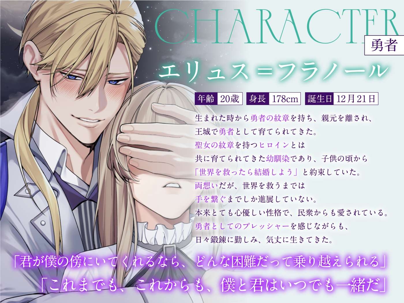 子供の頃から淡い恋心を持っていたエリュスとヒロインは、幼い日の約束「世界を救ったら結婚しよう」との想いを胸にして…。