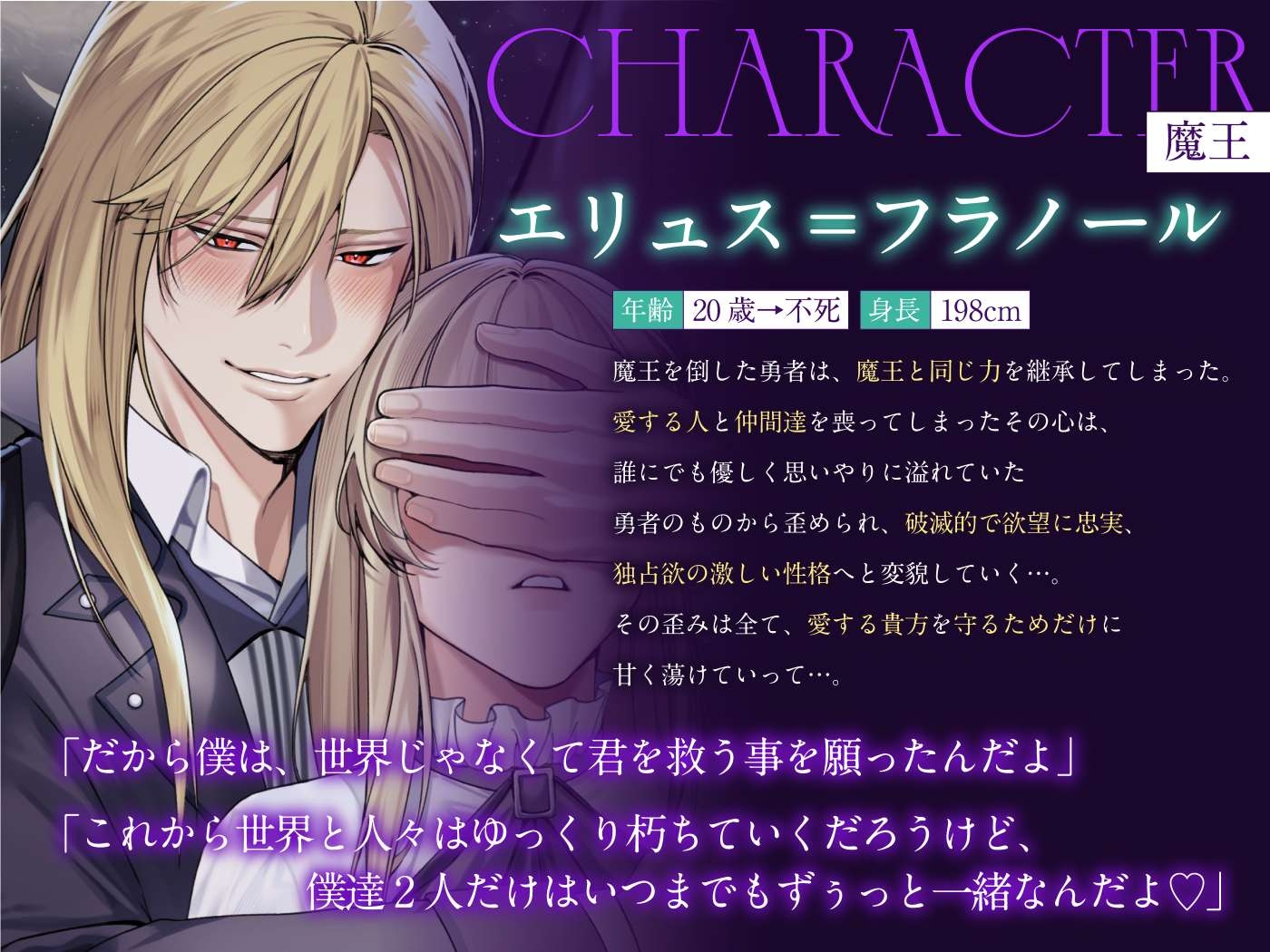 「このままだと世界は崩壊していくけれど、大丈夫。僕と君だけは、これからも一緒に生きていけるんだからさ」と、勇者の闇堕ちを目の当たりにして戸惑う貴方を押し倒すエリュス。「ずっとずっと、君の事が好きだったんだ…」と愛を告白されてーー。