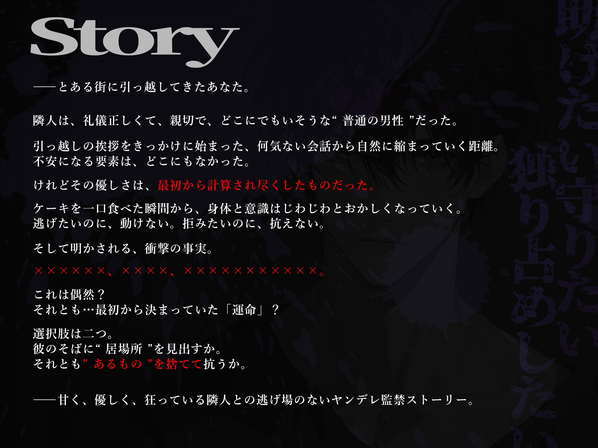 ――甘く、優しく、狂っている隣人との逃げ場のないヤンデレ監禁ストーリー。