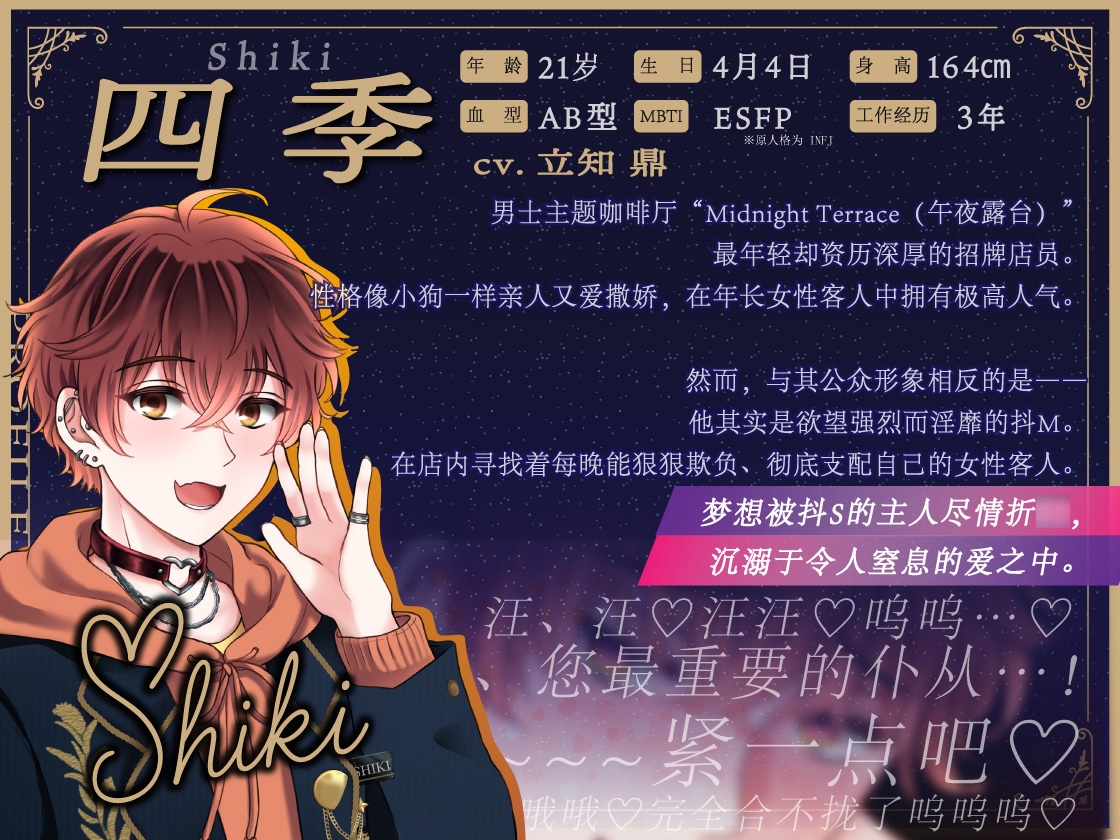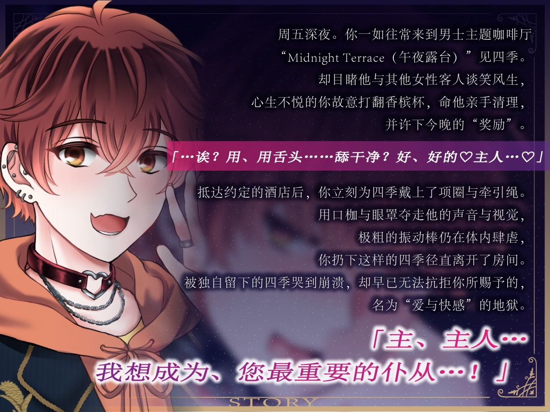 这是一部女性主导的情境音声系列。在爱或性方面有困扰的“有故事”的店员们集结而成的男士主题咖啡厅“午夜露台”,作为顾客的“你”,将会让他们在与你激烈的游戏下身心皆沉溺于快乐之中。