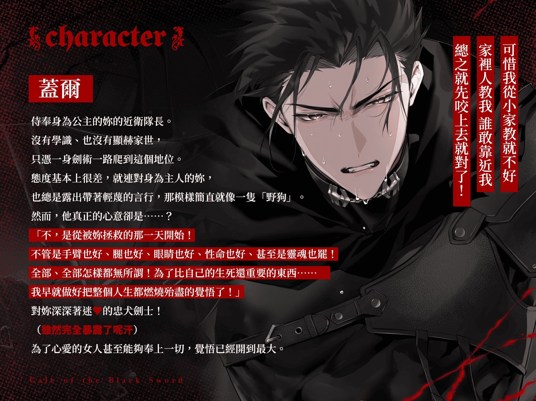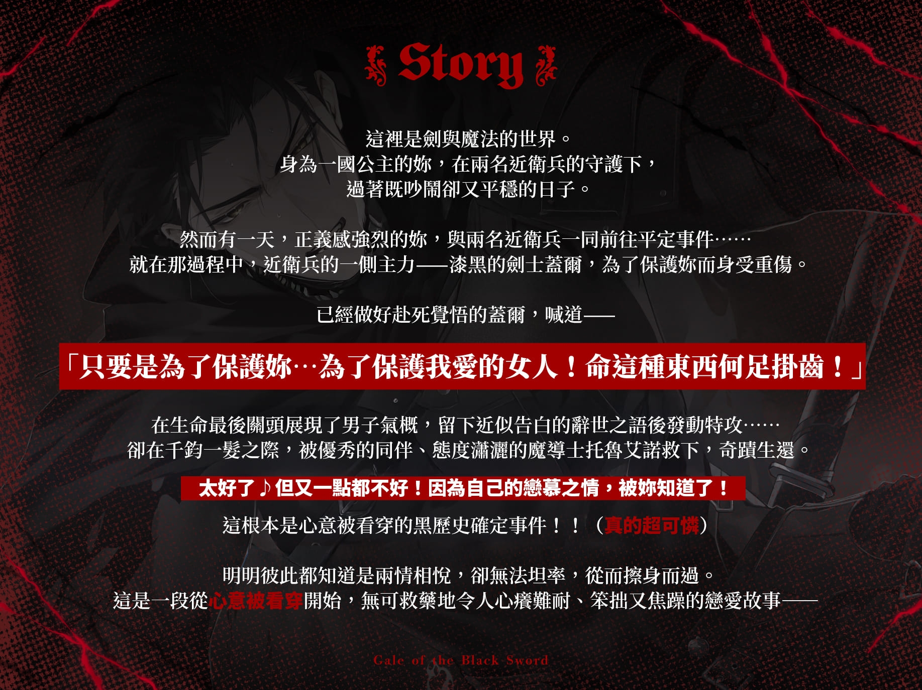 就在那過程中,近衛兵的一側主力——漆黑的劍士蓋爾,為了保護妳而身受重傷。