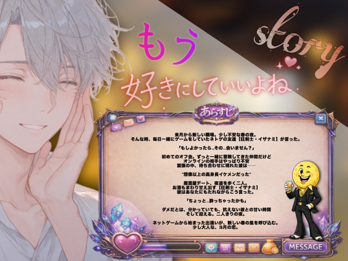 4月から新しい会社に就職する事になり、不安を抱える貴方。友達もみんな卒業してしまい、相談する人もいなく貴方はネットゲームに心の拠り所を見出す。貴方が唯一心を許せる存在はゆうき。彼に悩みを相談したり、彼を慕っている。そんな彼からデートを誘われ貴方は承諾する。