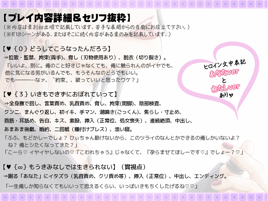 ※作中には、拉致、監禁、拘束、無理矢理の調教、刃物での脅し、若干のストーカー行為等の描写を含みます。