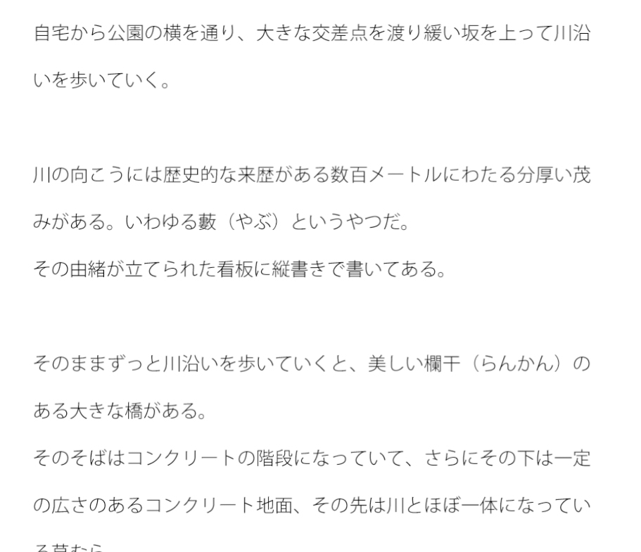 自宅から公園の横を通り、大きな交差点を渡り緩い坂を上って川沿いを歩いていく。
