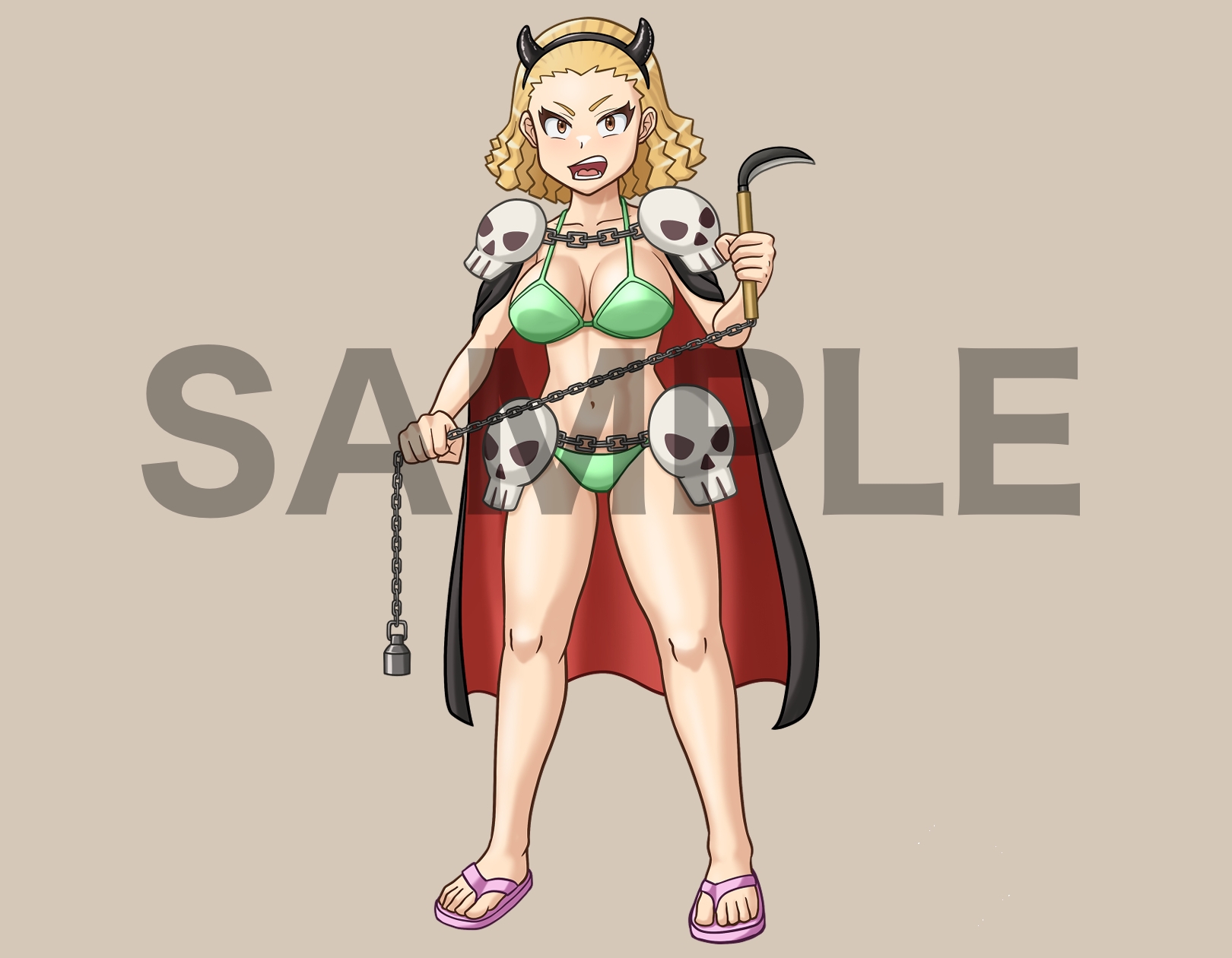 ゲーム、動画、TRPGなど自由に使える立ち絵素材、鎖鎌を持った、オールバック金髪ソバージュの水着女性、C23