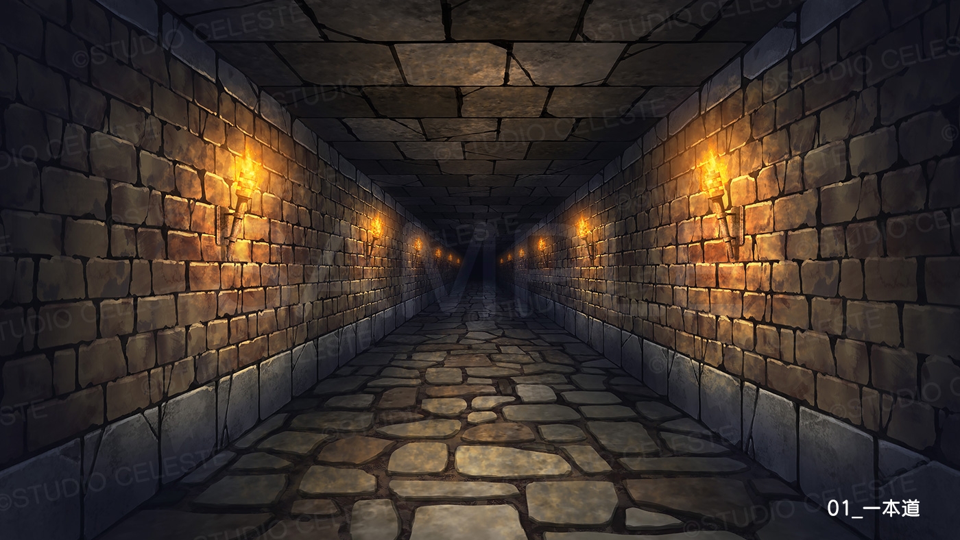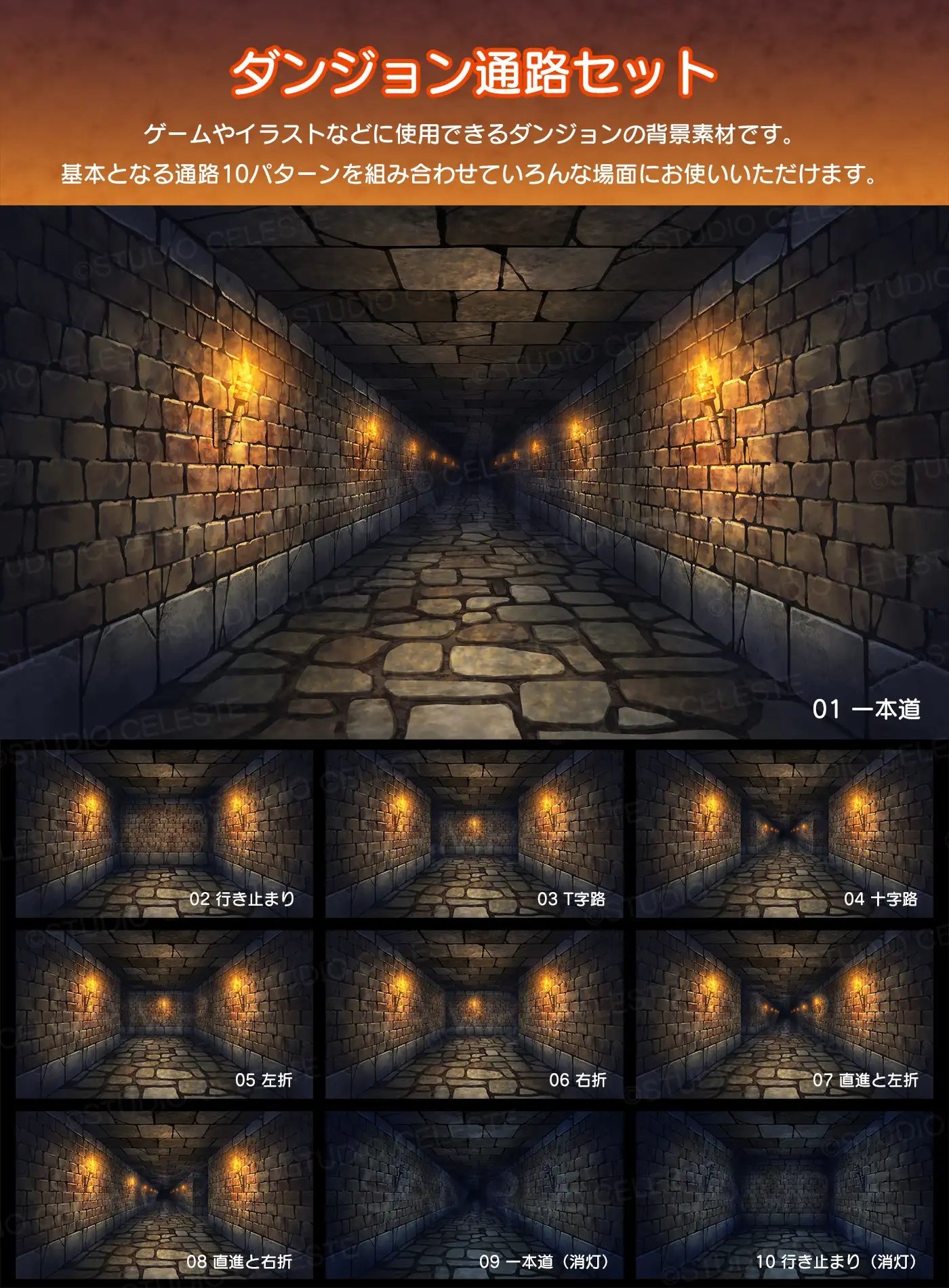 ゲーム背景などに使用できるダンジョンの通路10種類セットです。