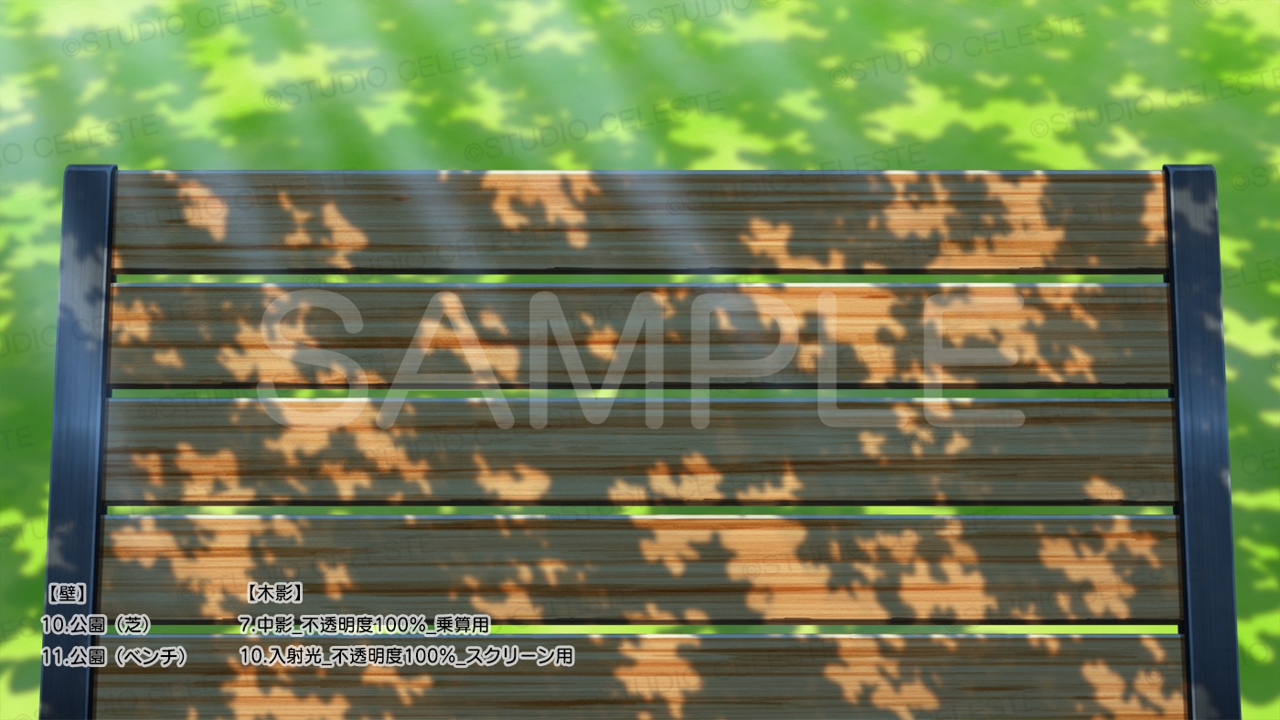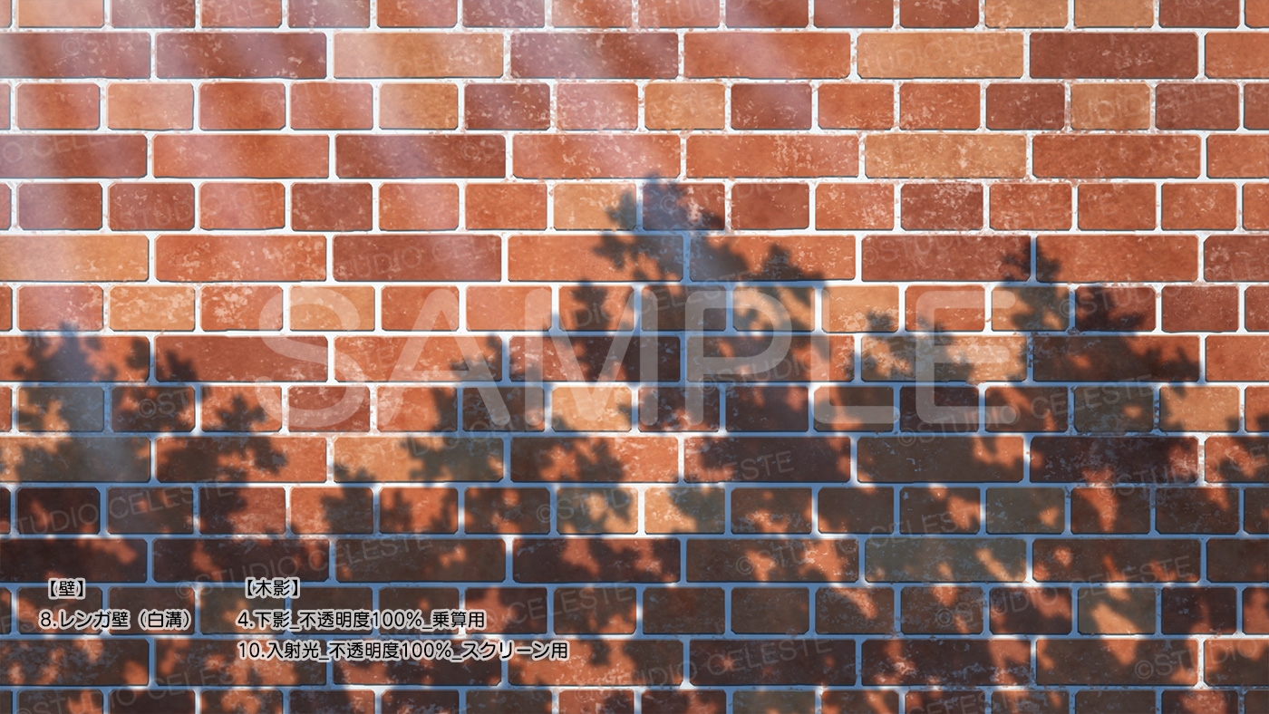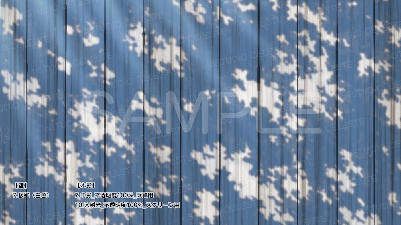 手軽に乗せて使える木影3種類と、色々な場所の壁6種類の背景素材です。