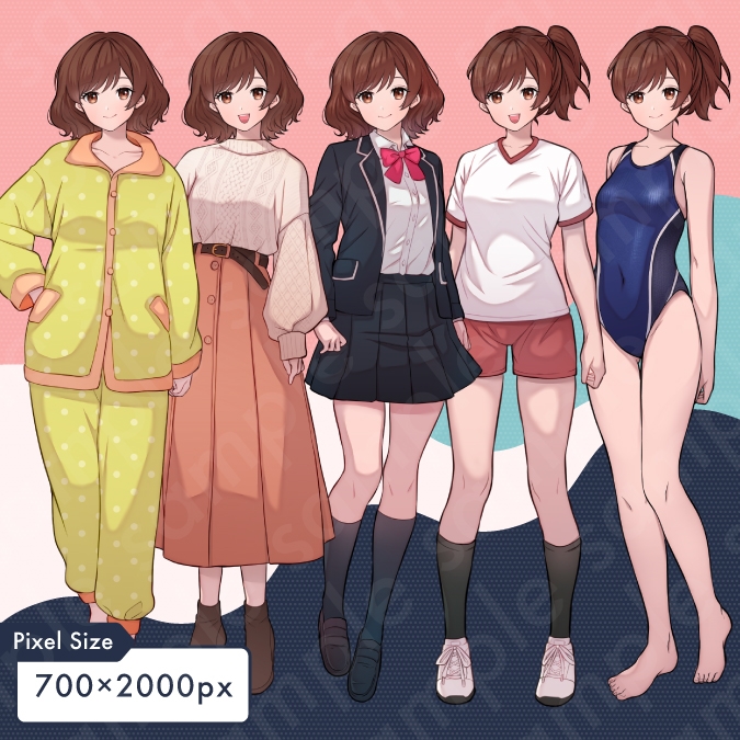 この作品は「【着せ替え立ち絵素材】女子高校生5種洋服セット:制服・スクール水着・体操服・私服・パジャマ (RJ01103677)」と内容の重複があります。