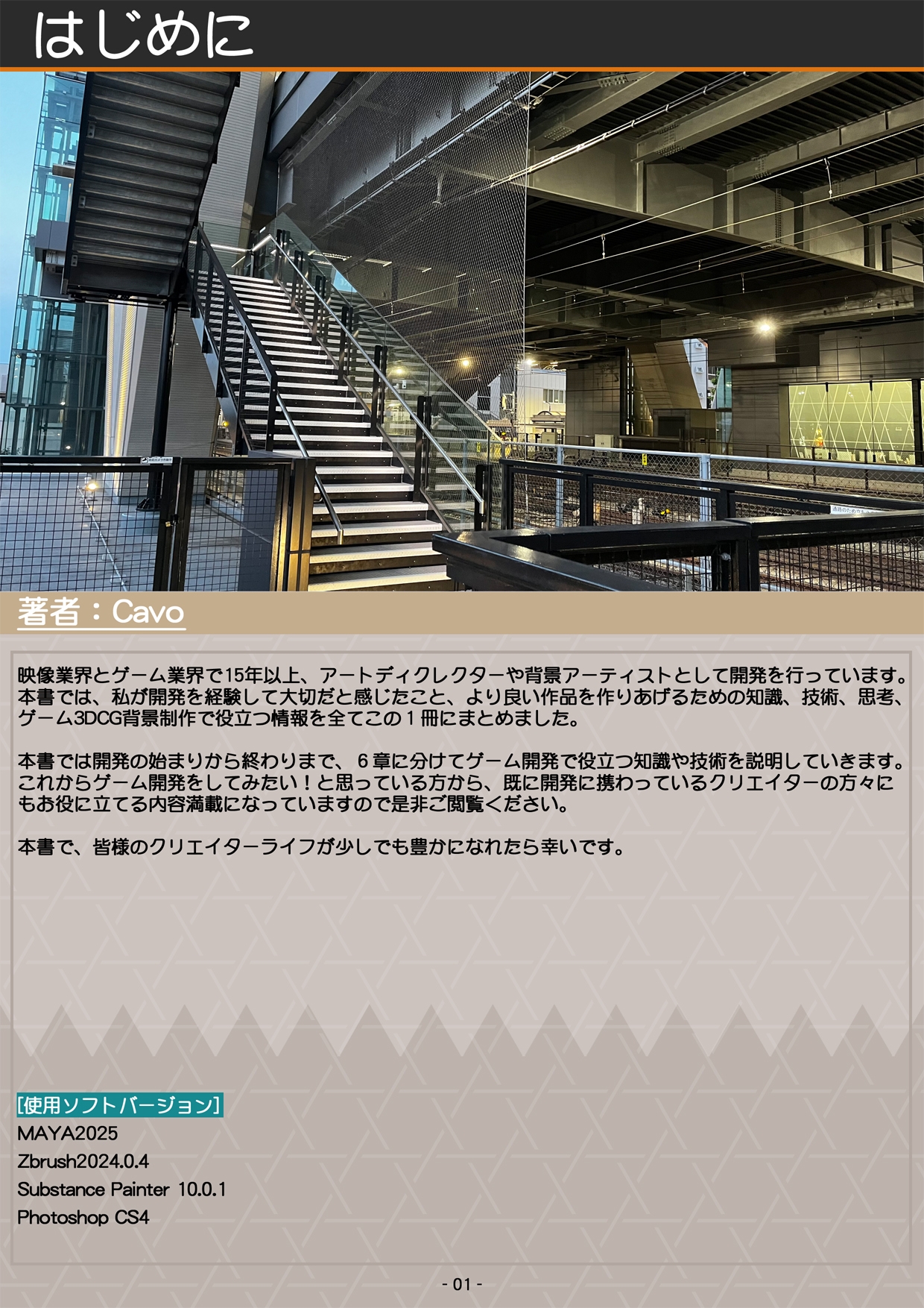 MAYA、Zbrsuh、Substance Painterを使用したアセットの作成、より良い作品を作りあげるための知識、技術、思考、ゲーム3DCG背景制作で役立つ情報を1冊にまとめました。